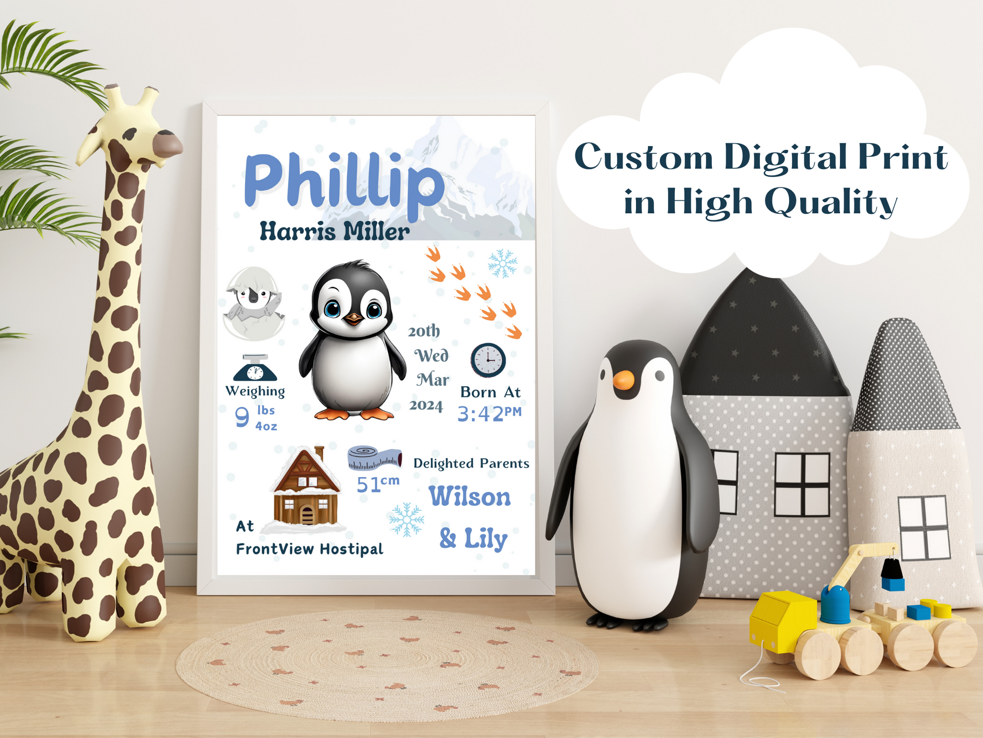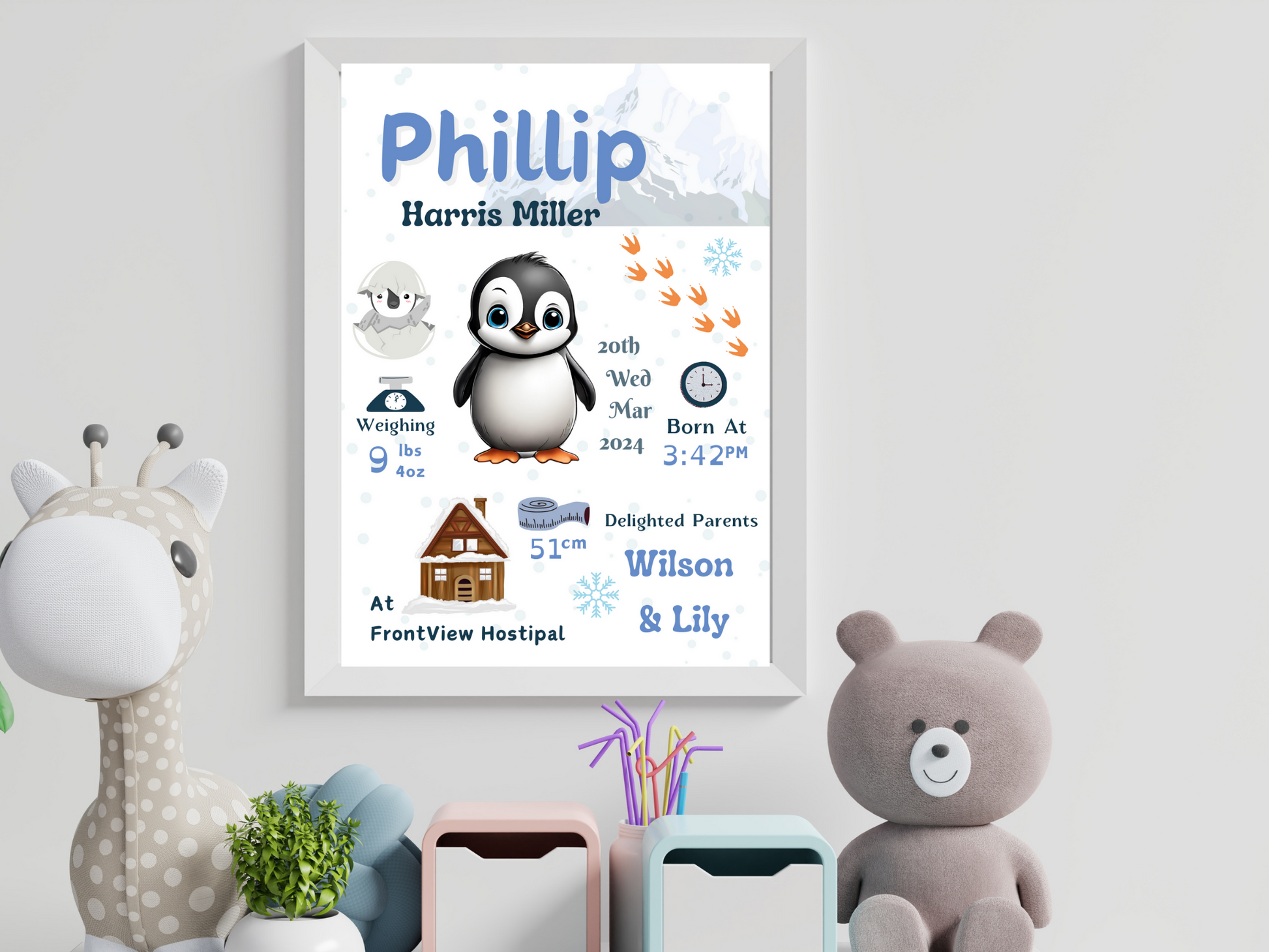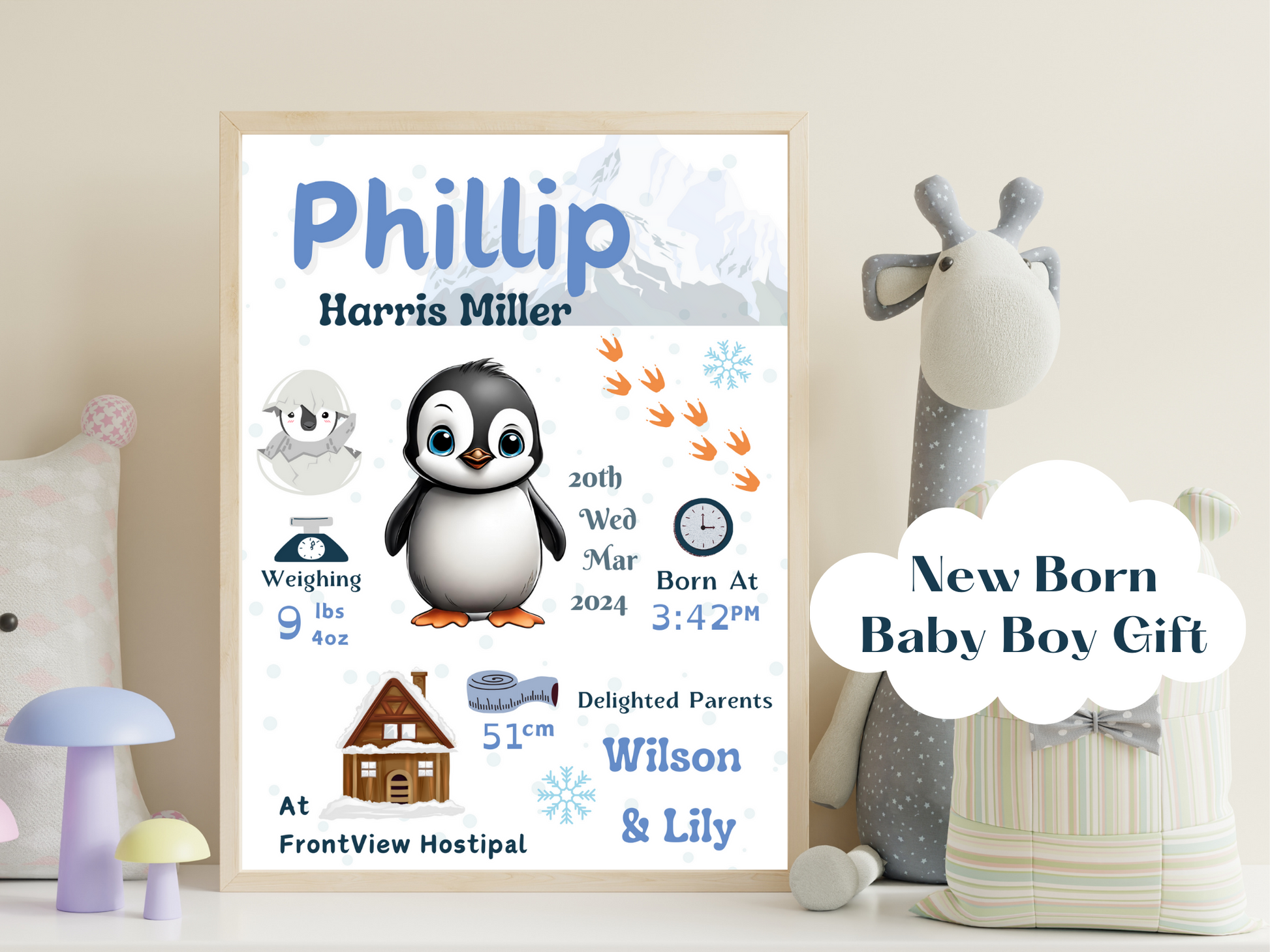 Baby Boy Gift, New Born Boy Baby Personalised Print For Boy, Gift for Baby Boy in Blue, Cute Little Penguin themed Boy Baby print, Baby Birth Details