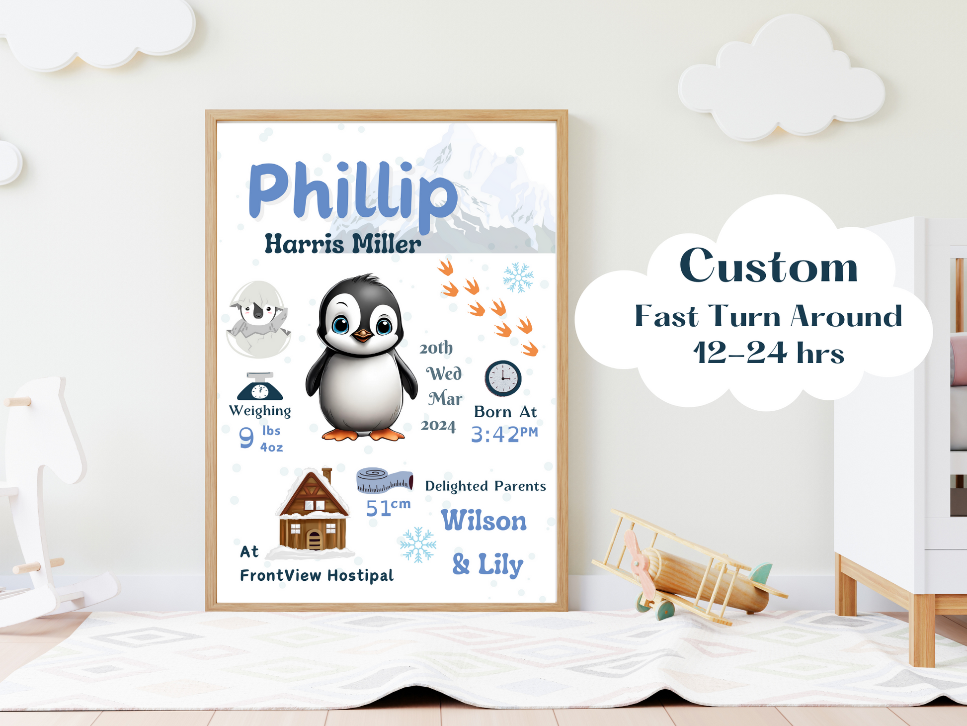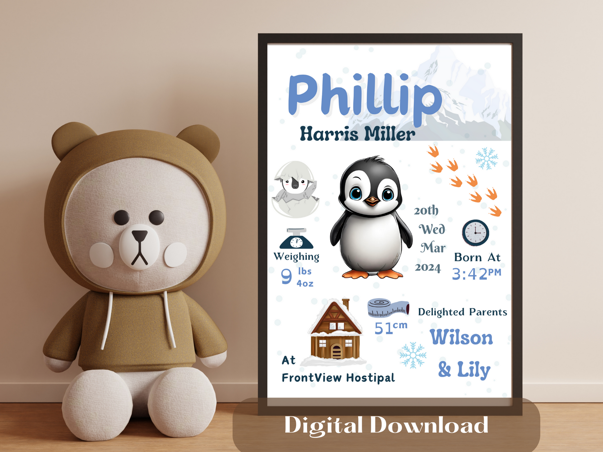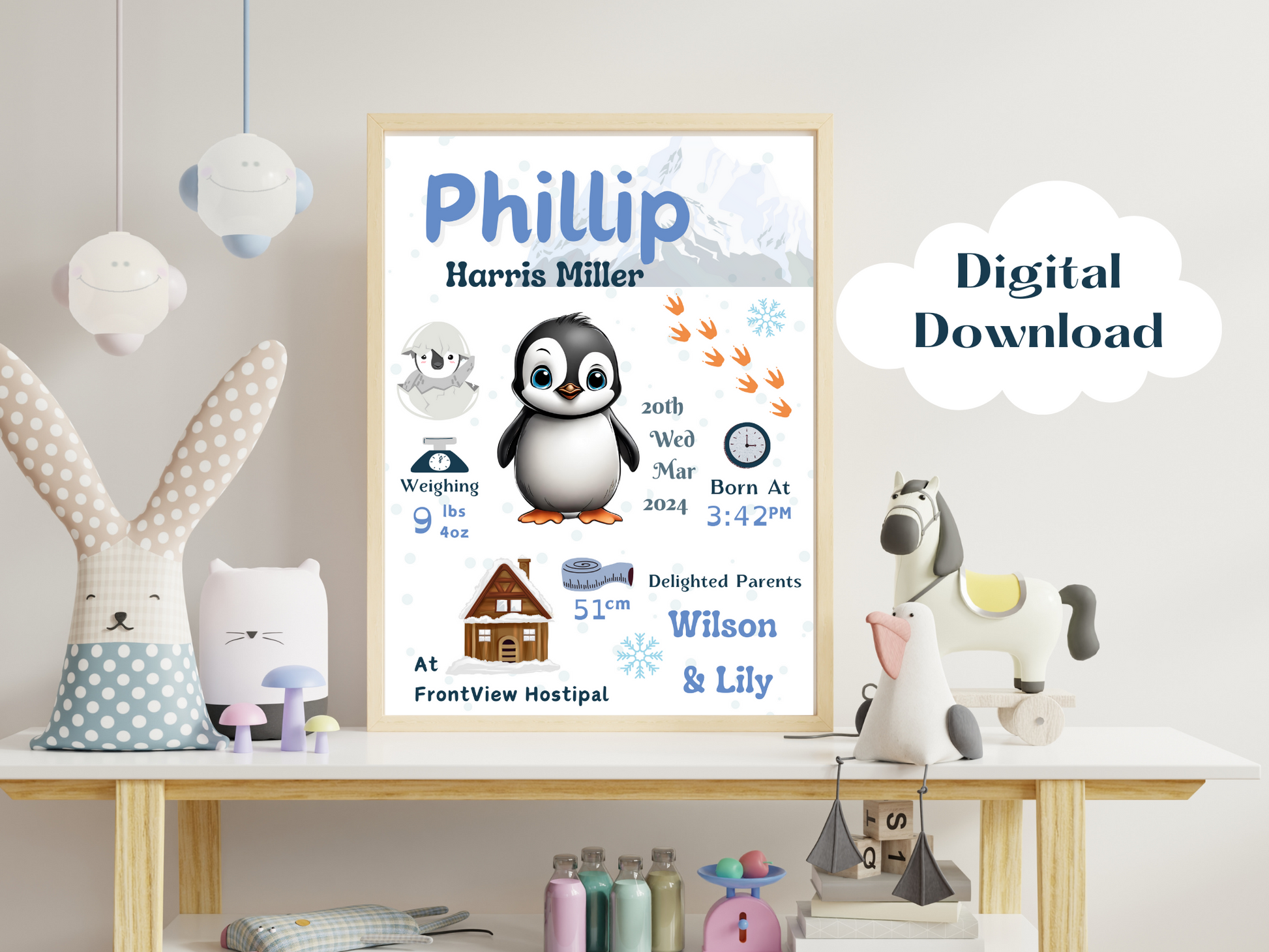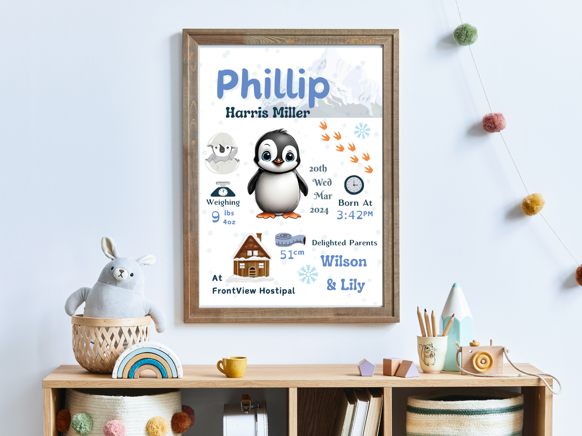 Baby Boy Gift, New Born Boy Baby Personalised Print For Boy, Gift for Baby Boy in Blue, Cute Little Penguin themed Boy Baby print, Baby Birth Details