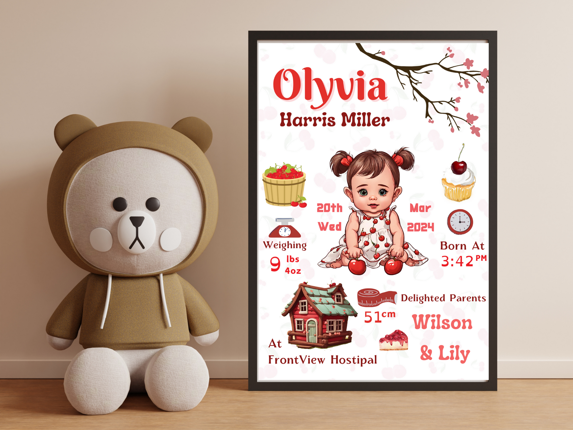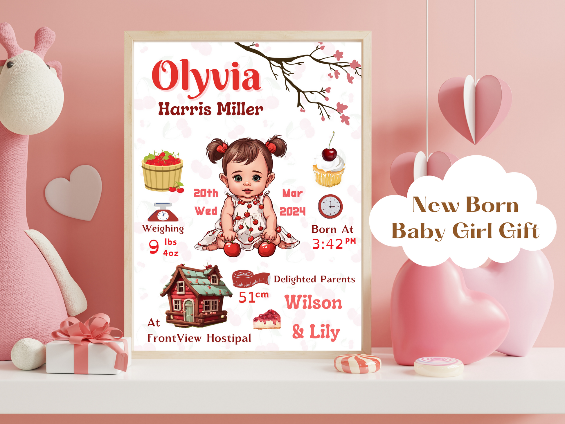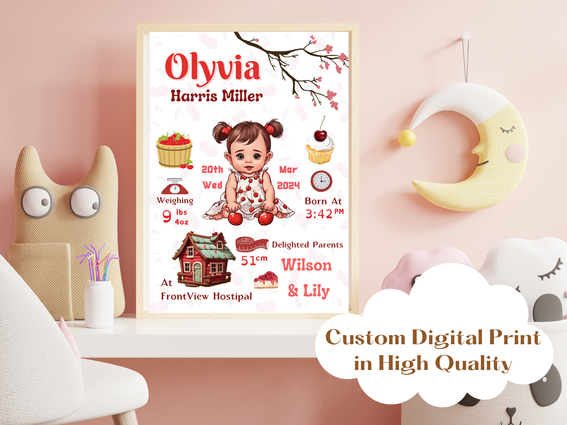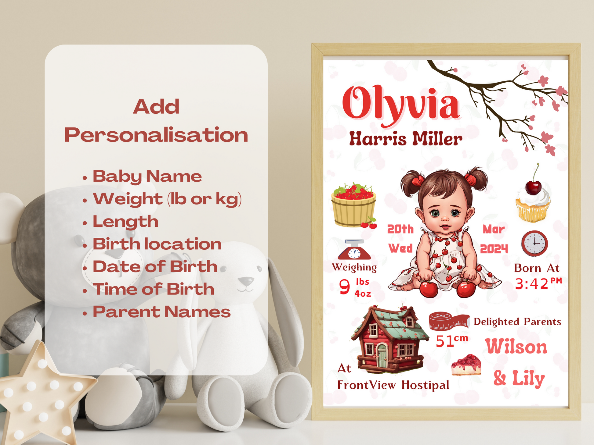 Custom New Born Baby Girl Gift, New Born Gift, Personalised Baby Girl Gift, Cherry Fruit themed Girl Baby Personalized print,Birth Detail