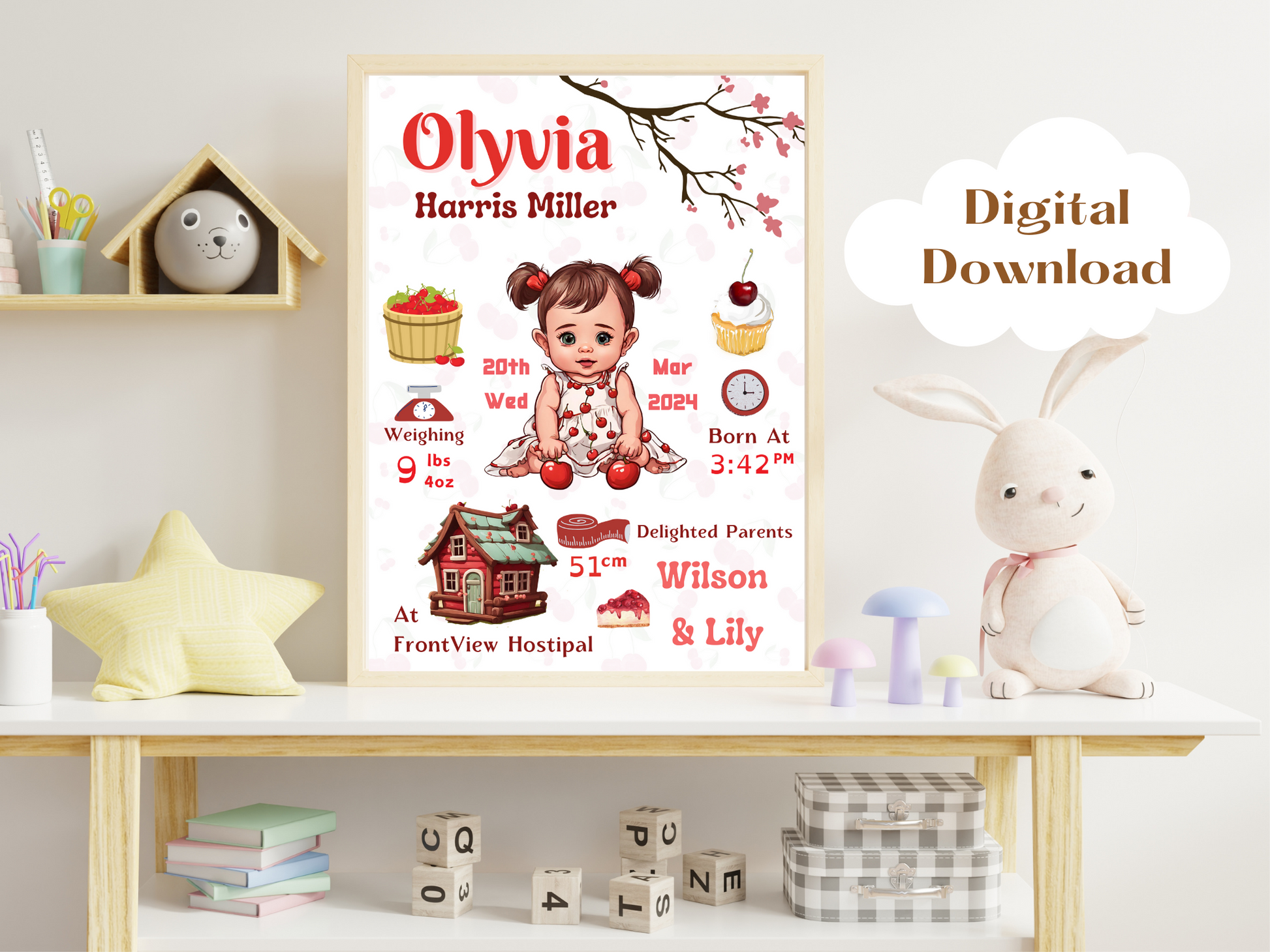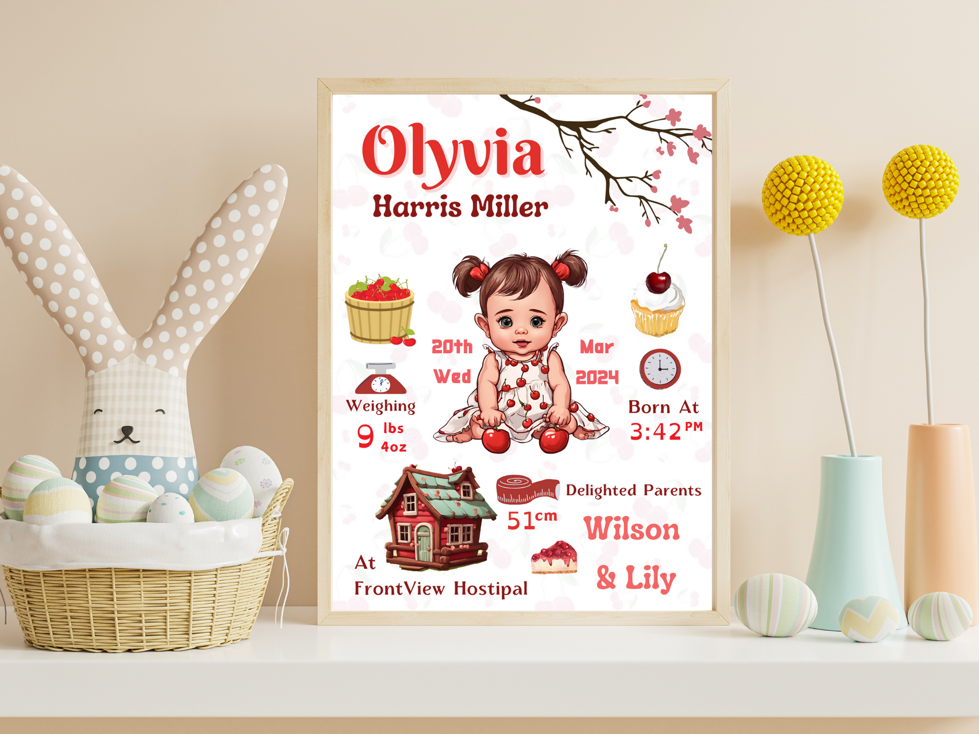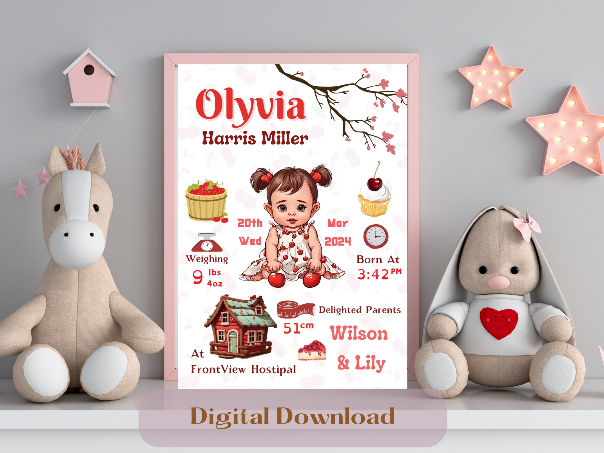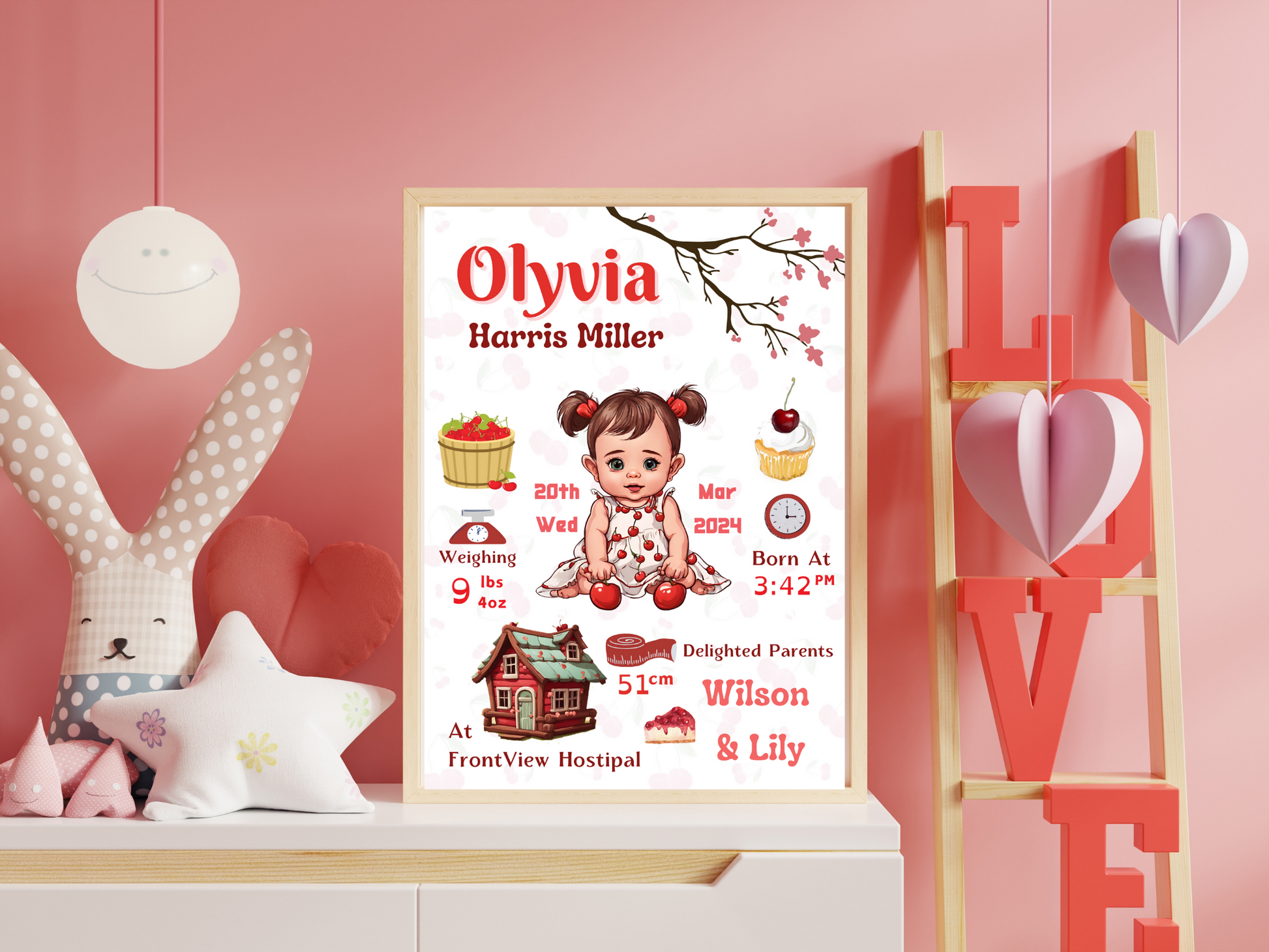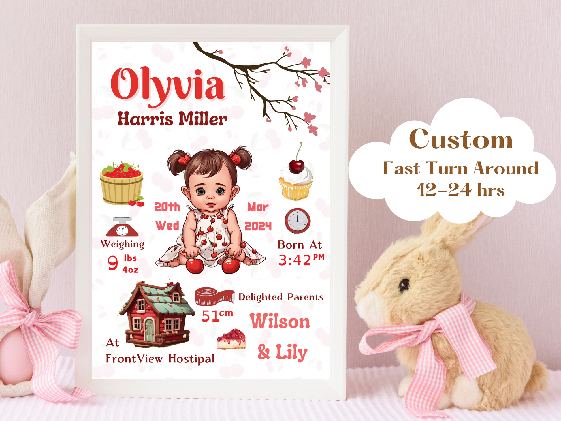 Custom New Born Baby Girl Gift, New Born Gift, Personalised Baby Girl Gift, Cherry Fruit themed Girl Baby Personalized print,Birth Detail
