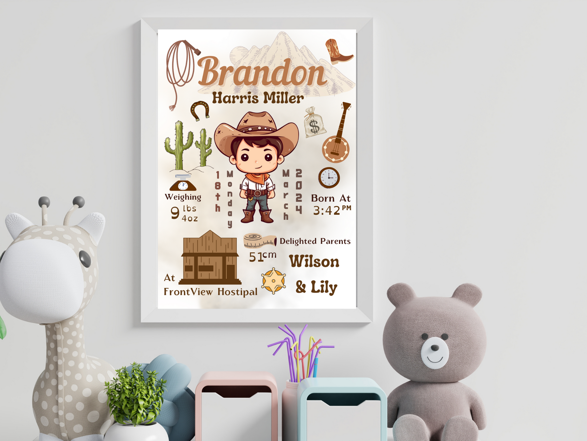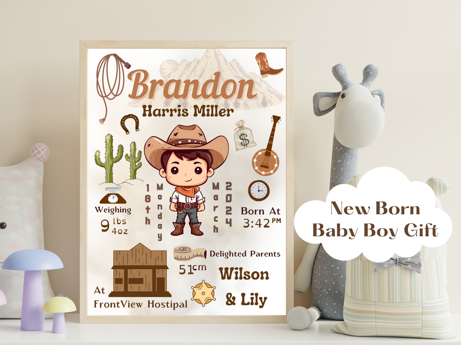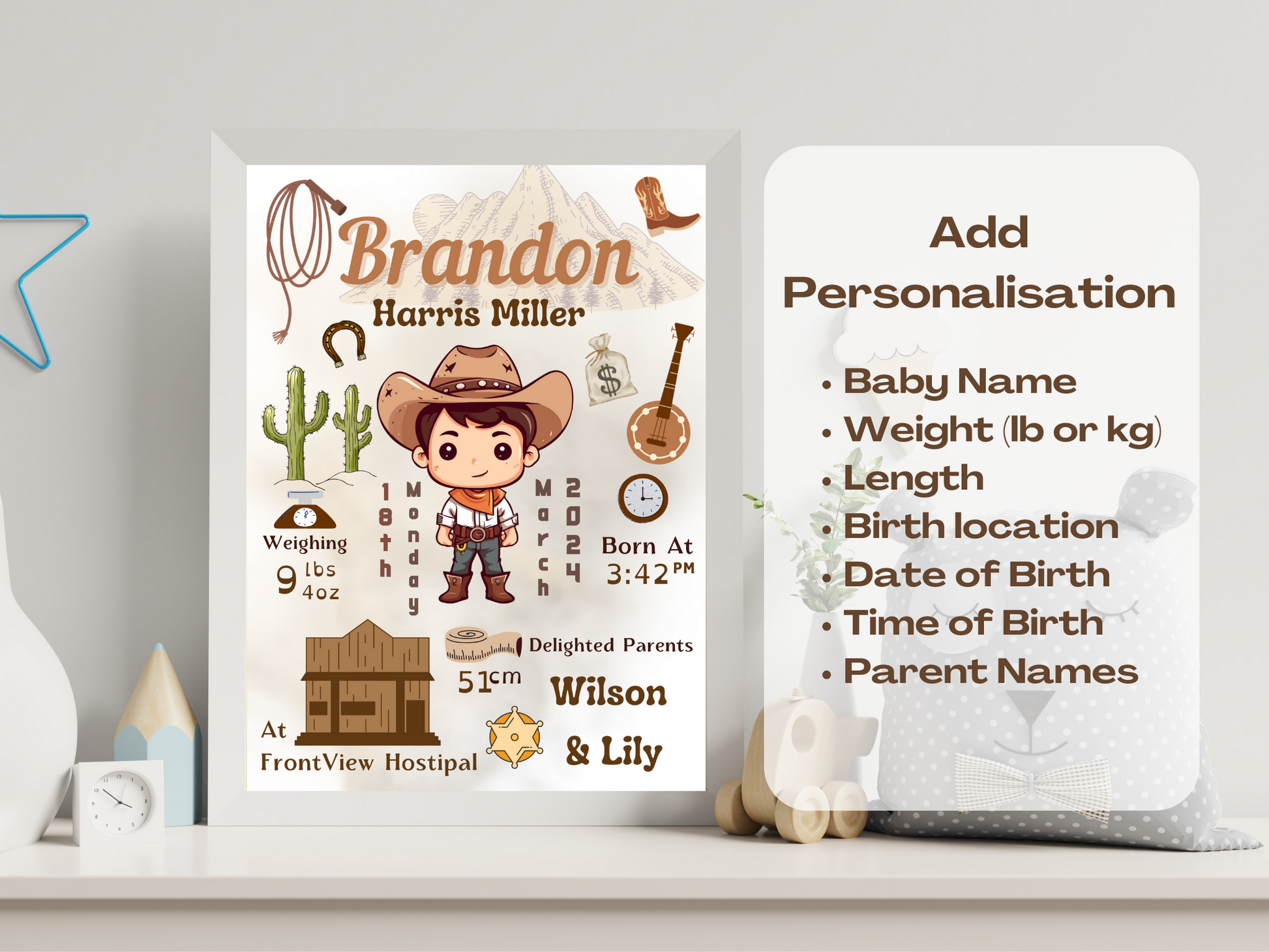 Baby Boy Gift, New Born Boy Baby Personalised Print For Boy, Gift for Baby Boy in Blue, Cowboy themed Boy Baby print, Baby Birth Details
