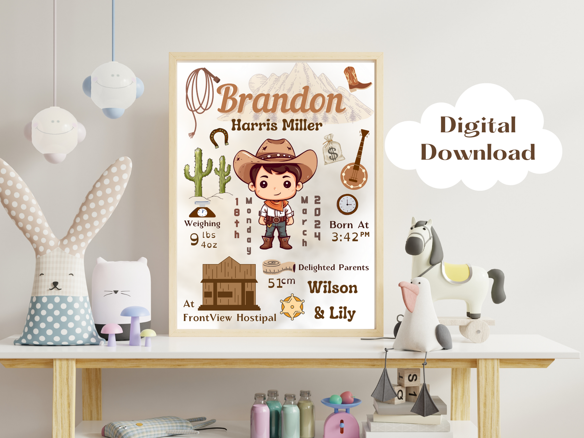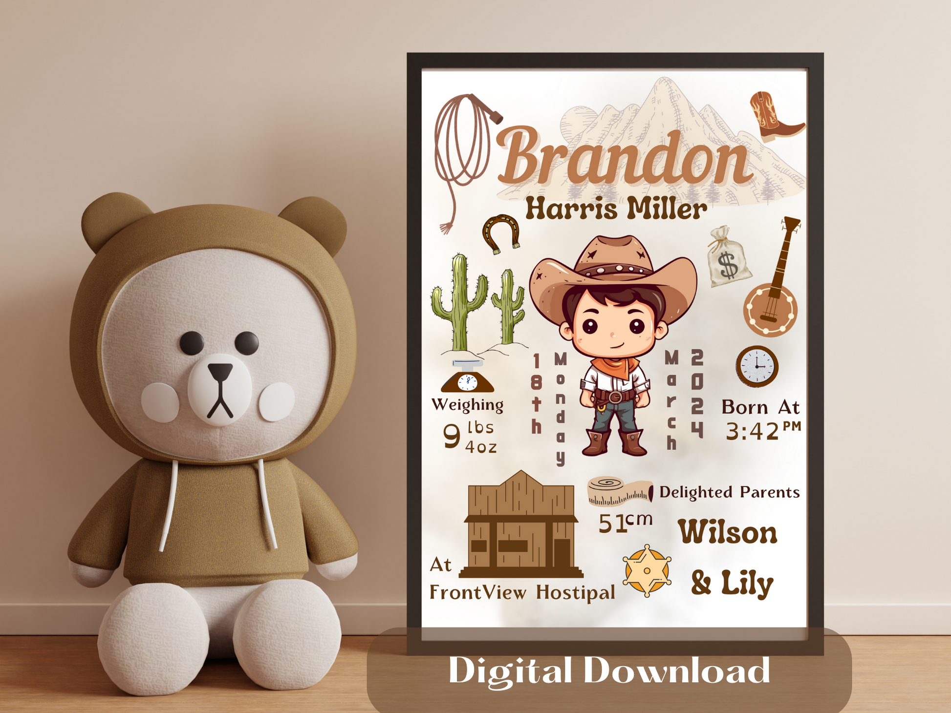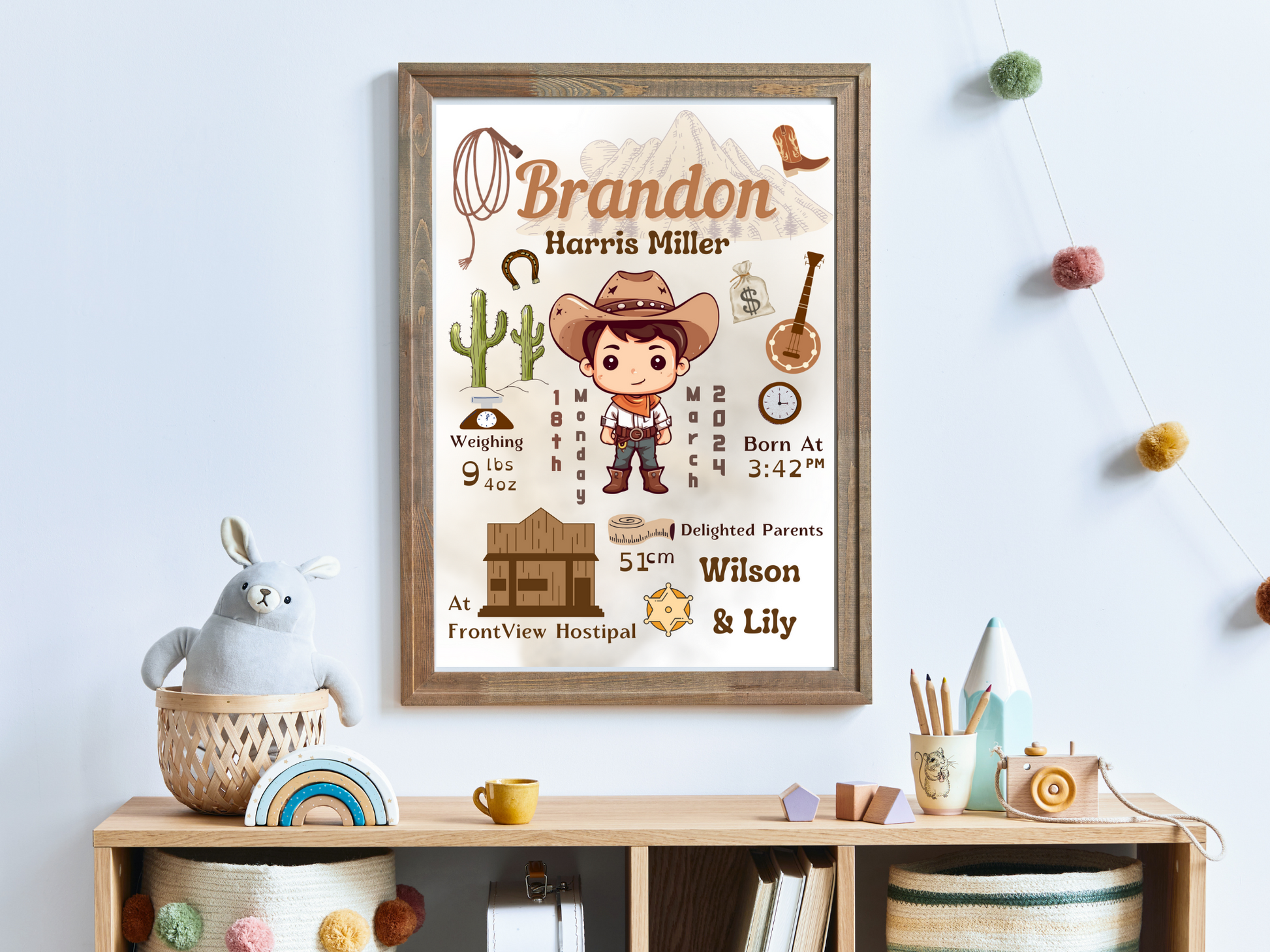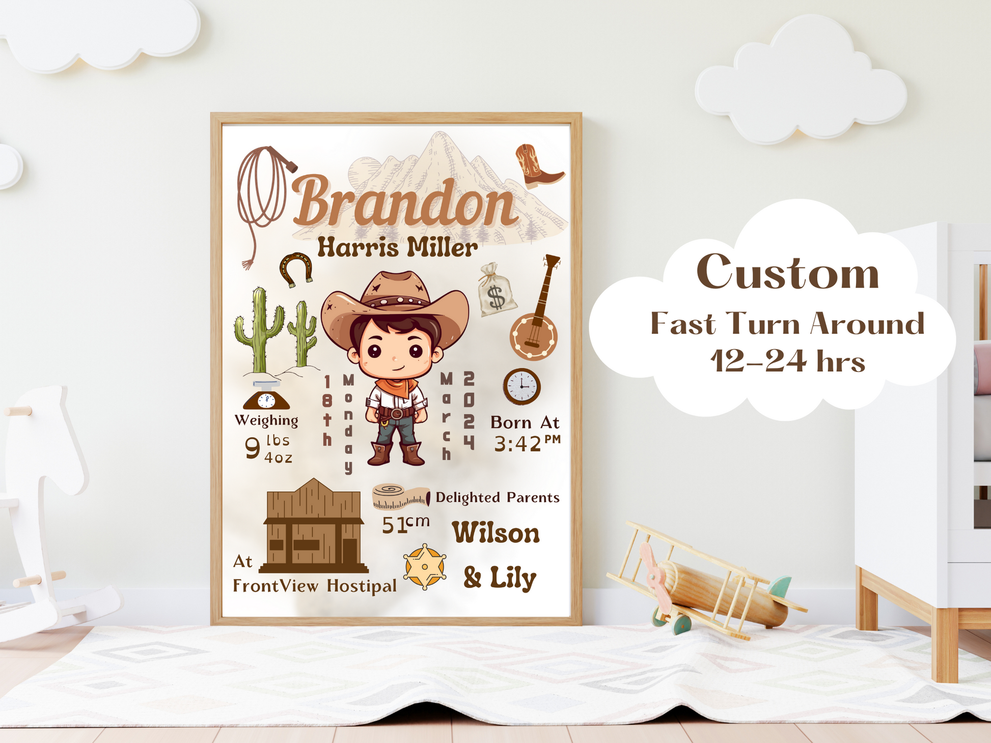 Baby Boy Gift, New Born Boy Baby Personalised Print For Boy, Gift for Baby Boy in Blue, Cowboy themed Boy Baby print, Baby Birth Details