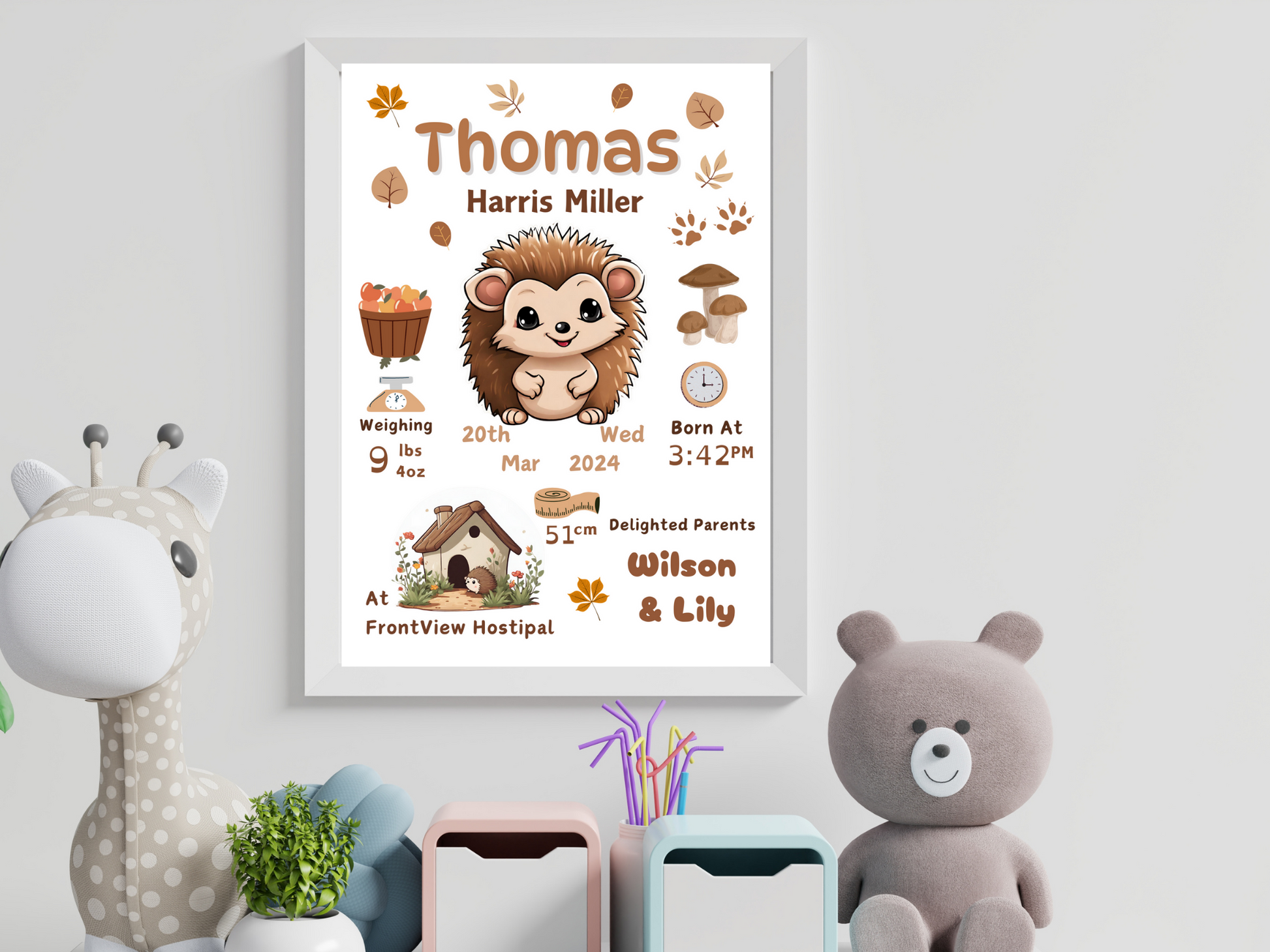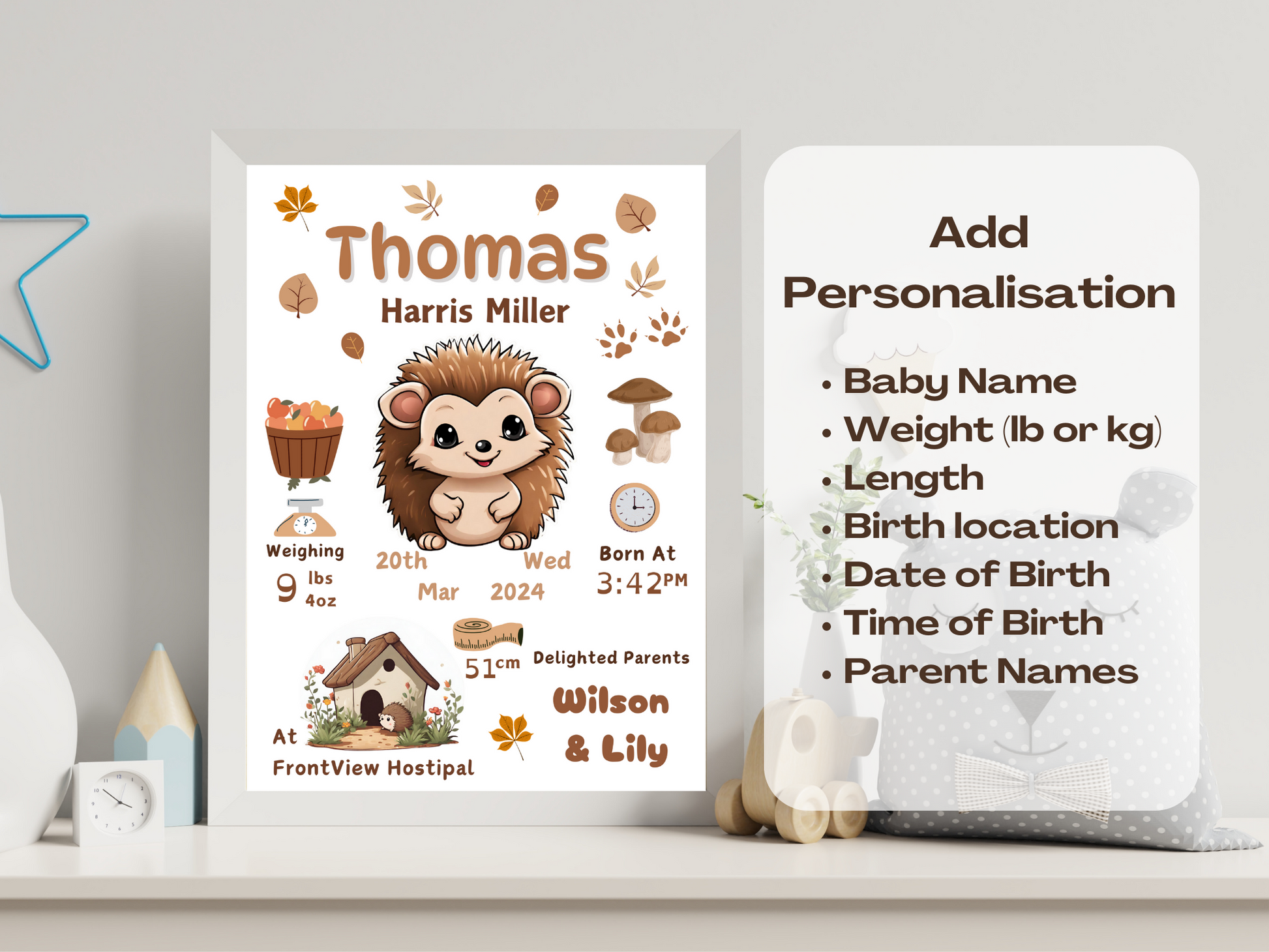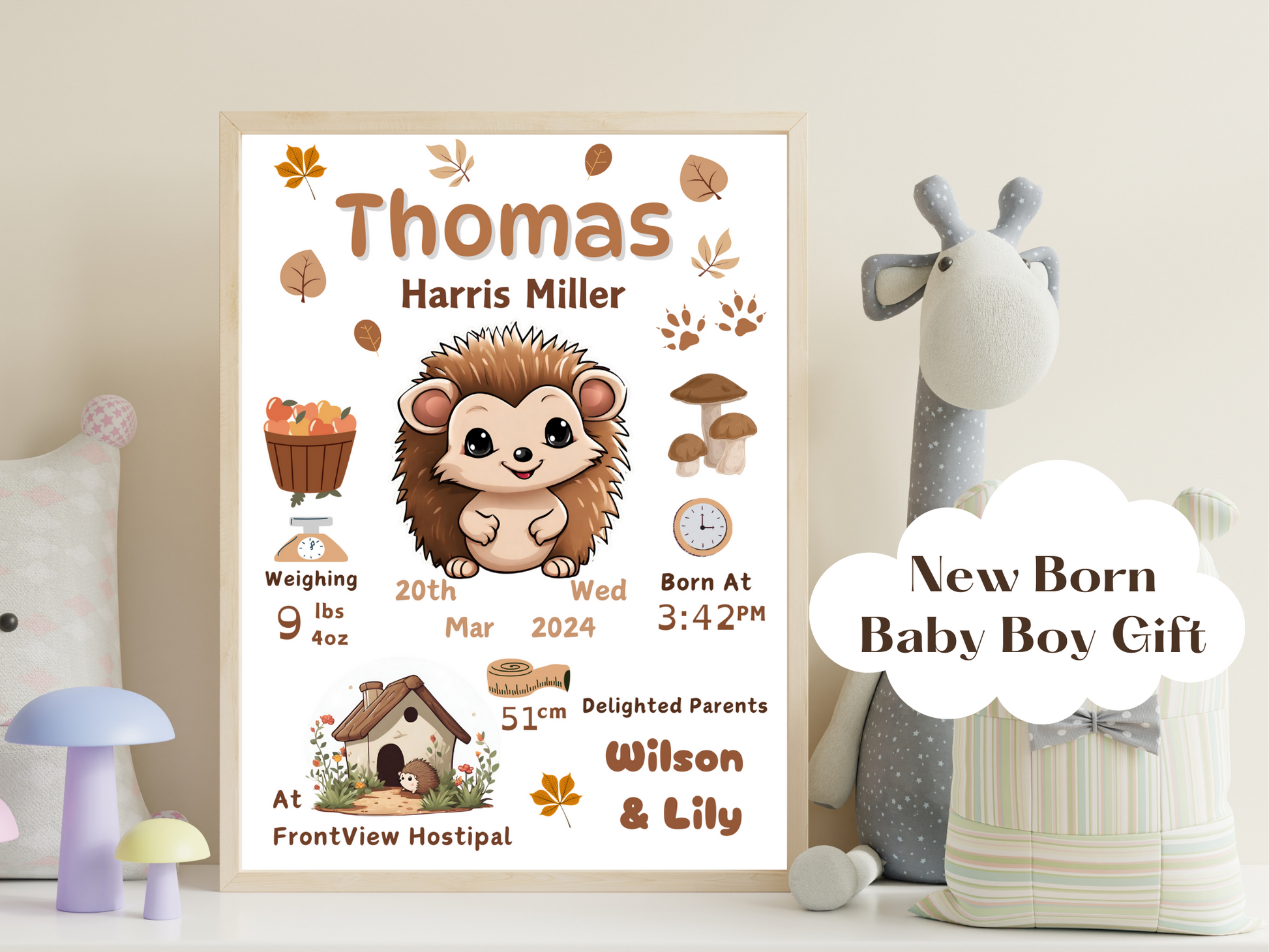 Cute Baby Hedgehog New Born Baby Boy Gift, Custom New Born Gift, Personalised Baby Boy Gift, Hedgehog themed Boy Baby print, Birth Detail Decor