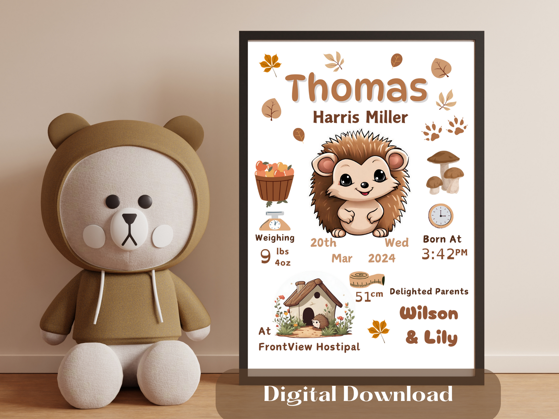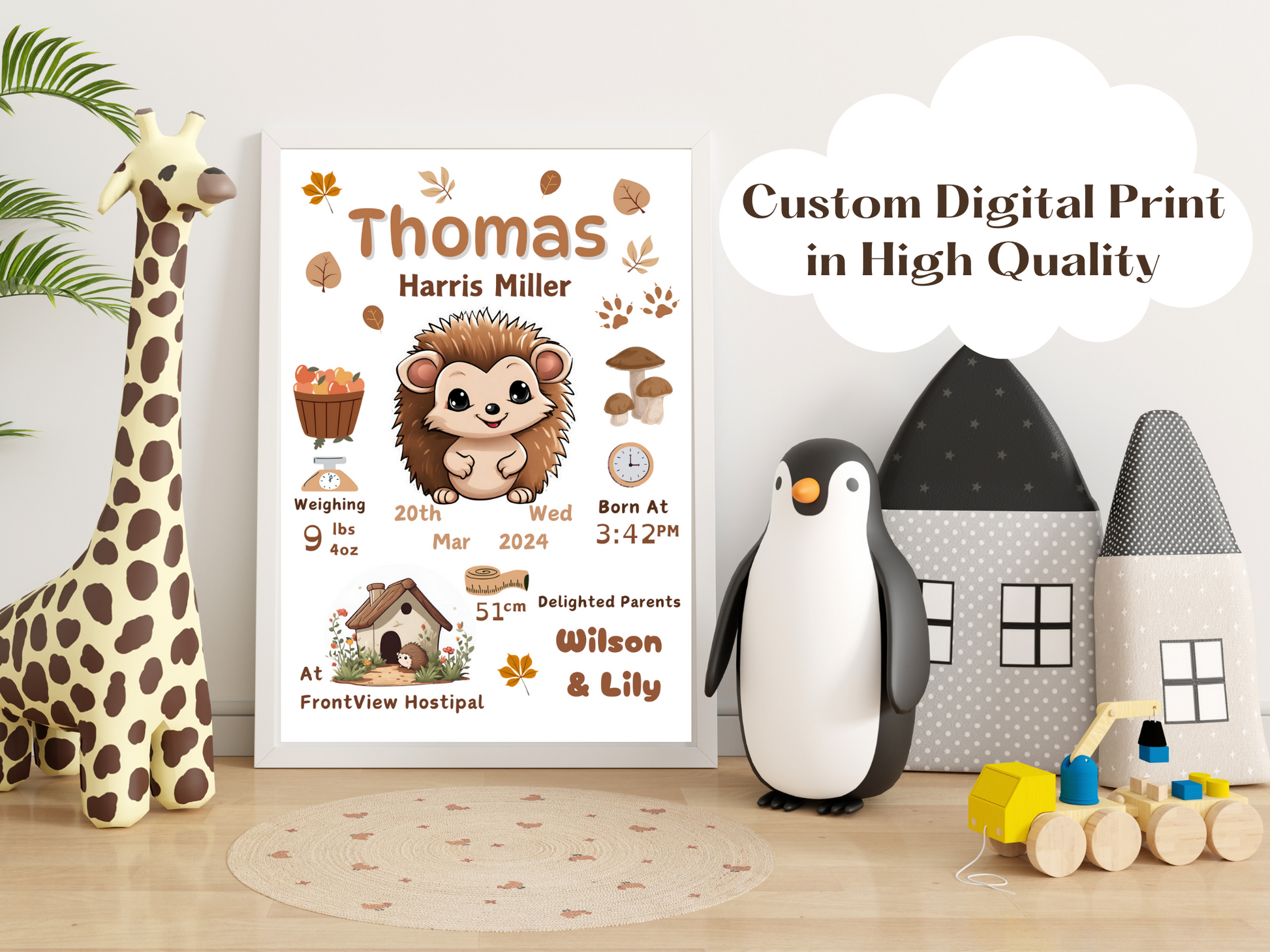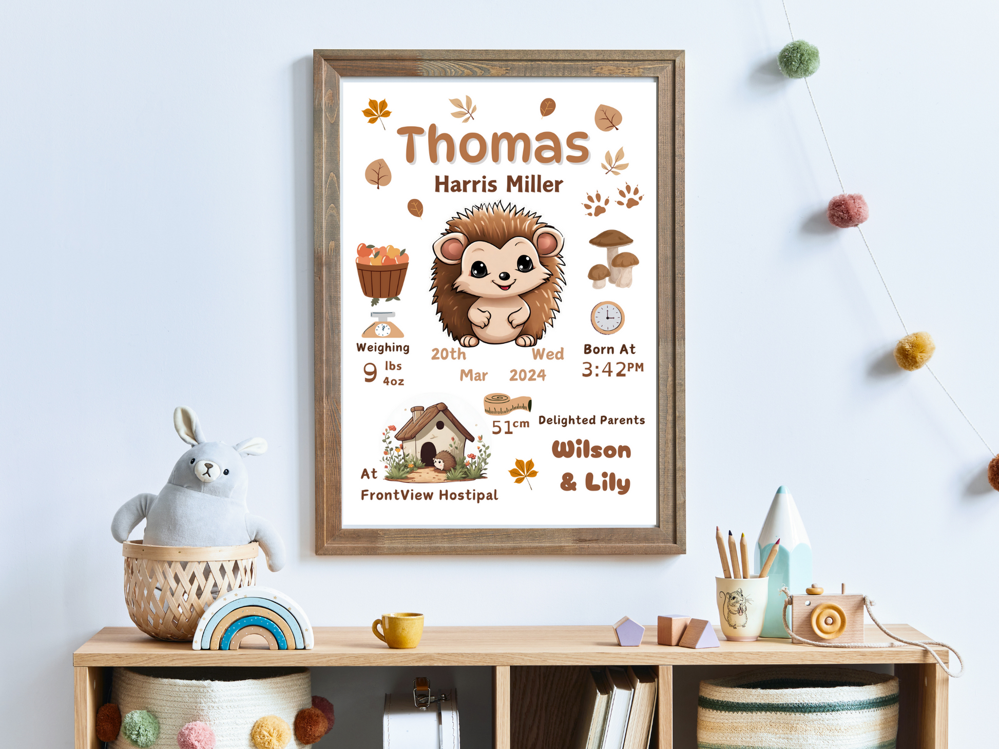 Cute Baby Hedgehog New Born Baby Boy Gift, Custom New Born Gift, Personalised Baby Boy Gift, Hedgehog themed Boy Baby print, Birth Detail Decor