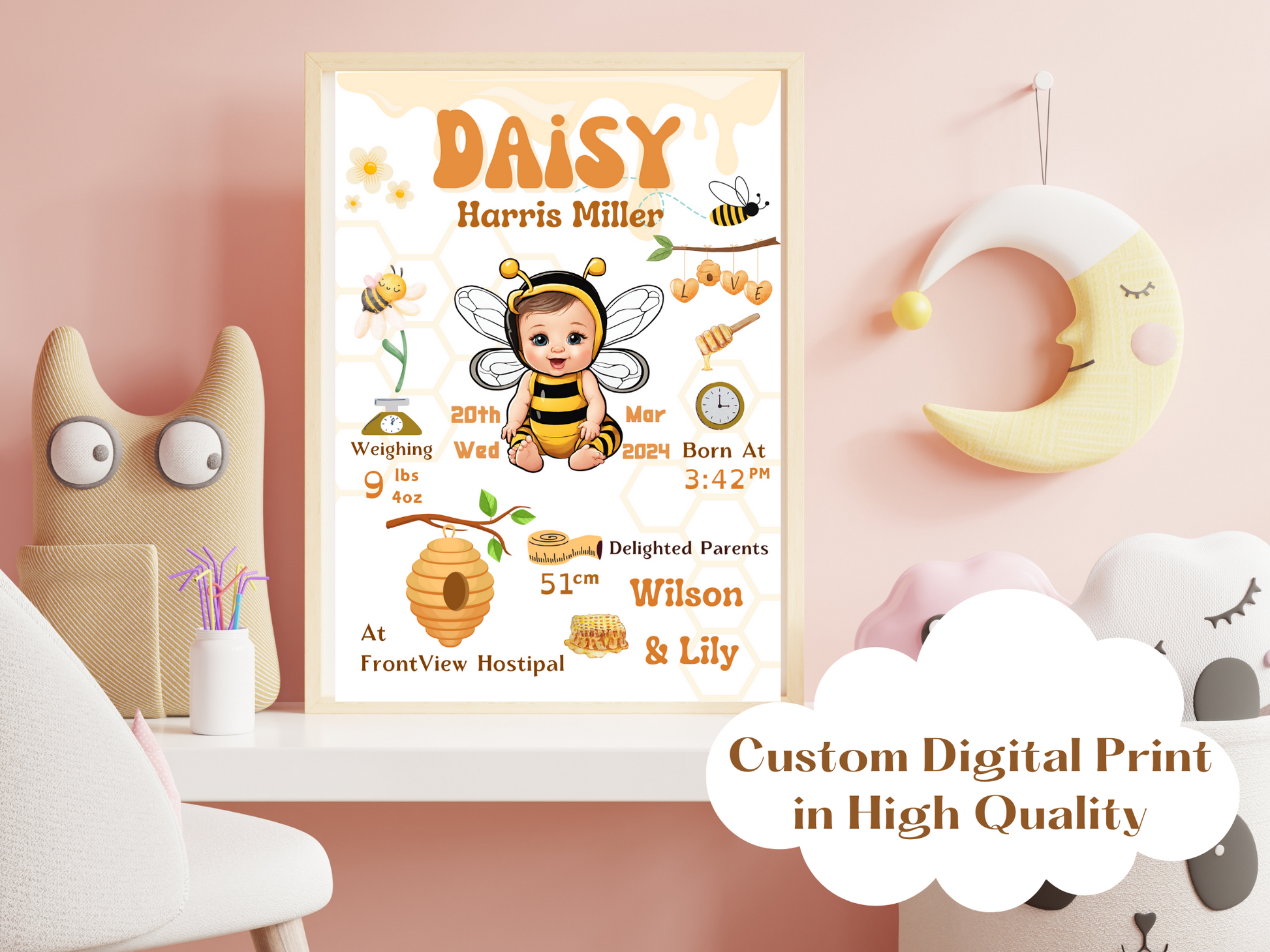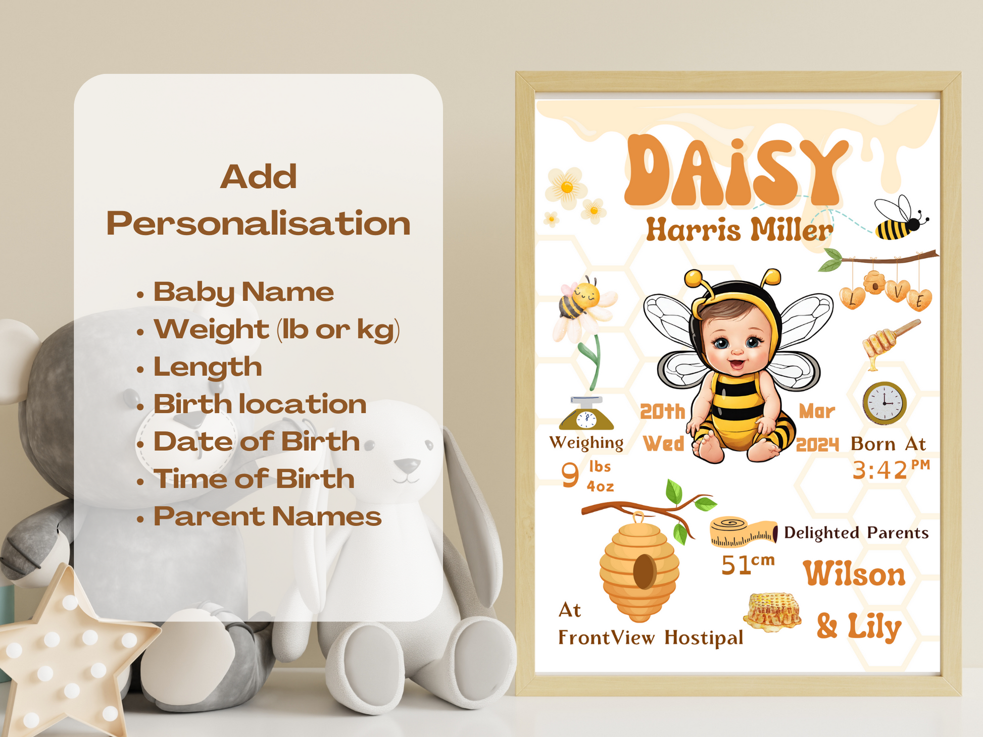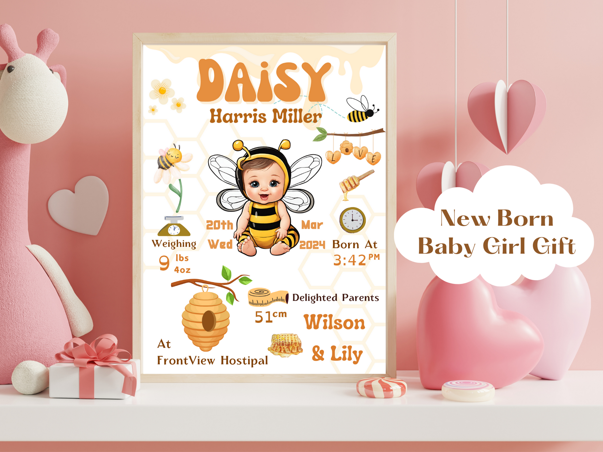 Custom New Born Baby Girl Gift, New Born Gift, Personalised Baby Girl Gift, Honey Bee themed Girl Baby Personalized print,Birth Detail