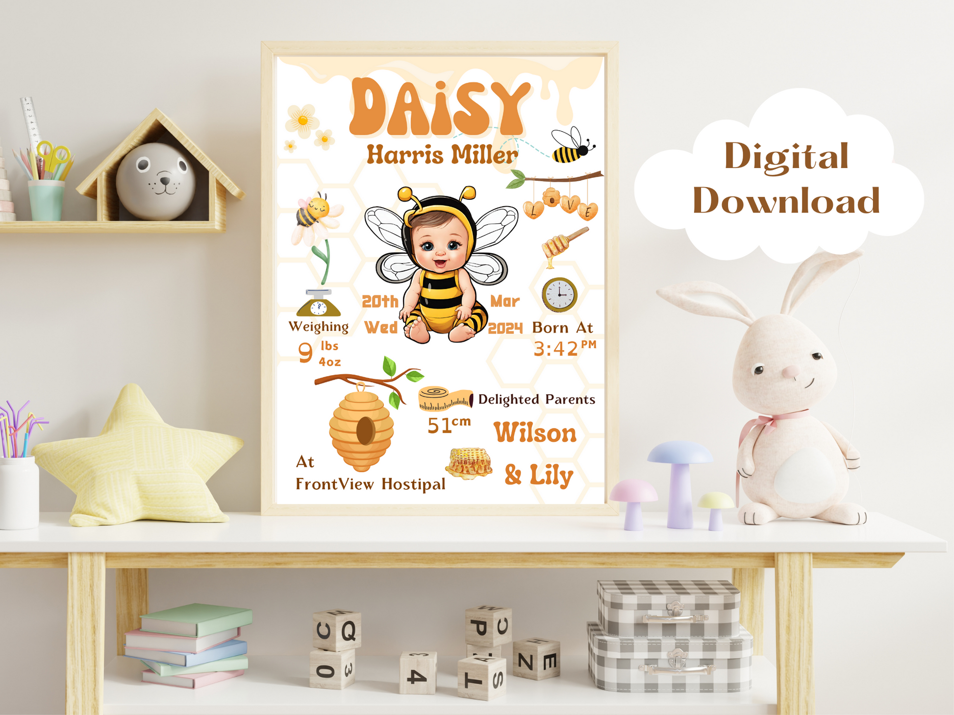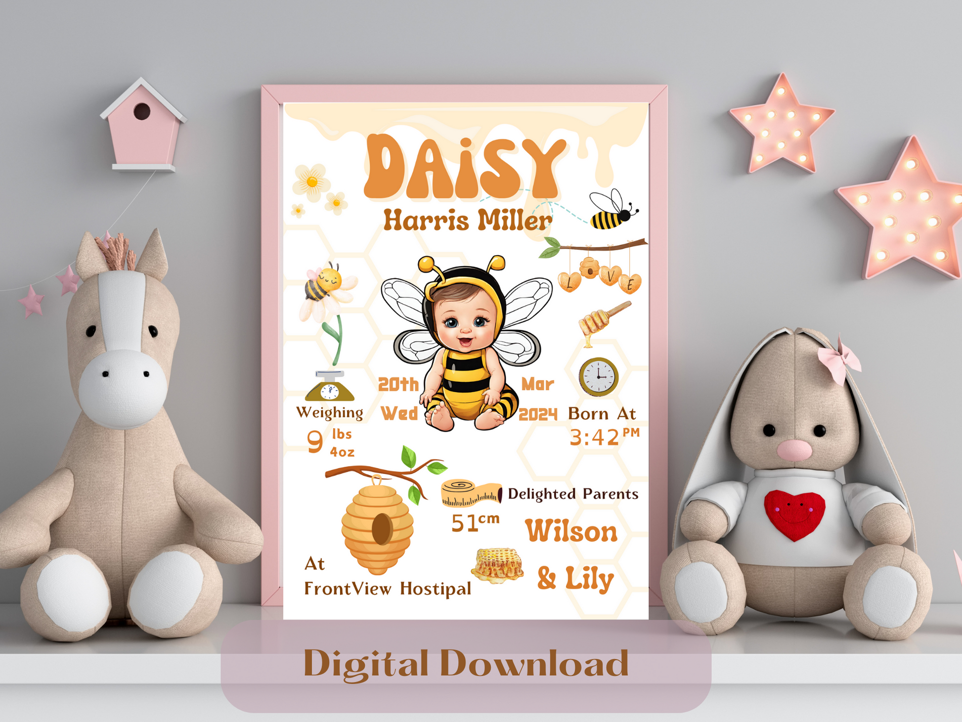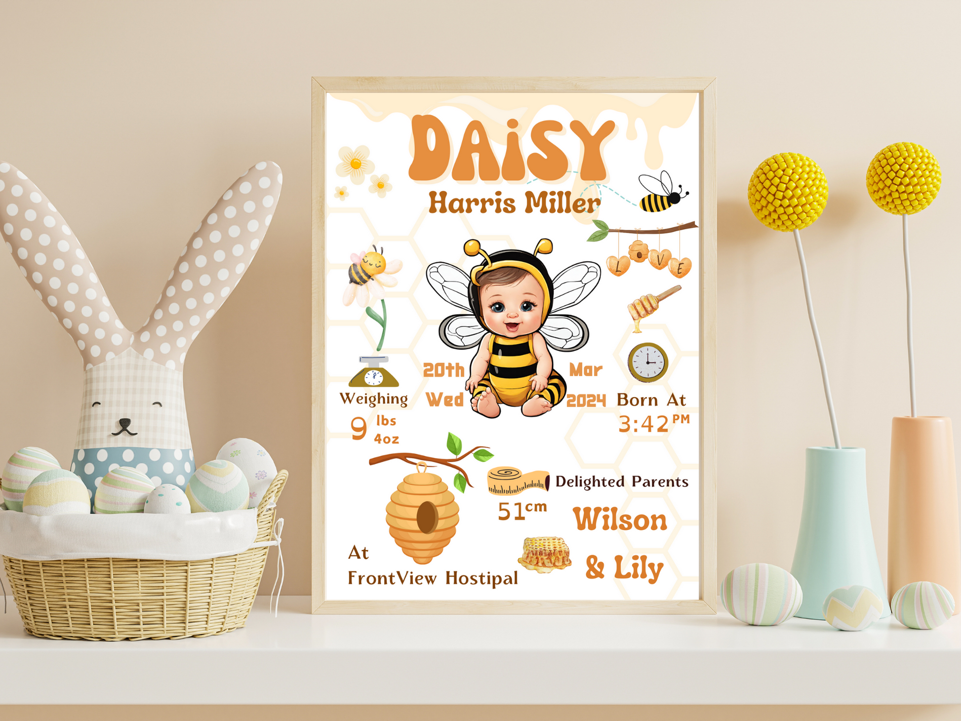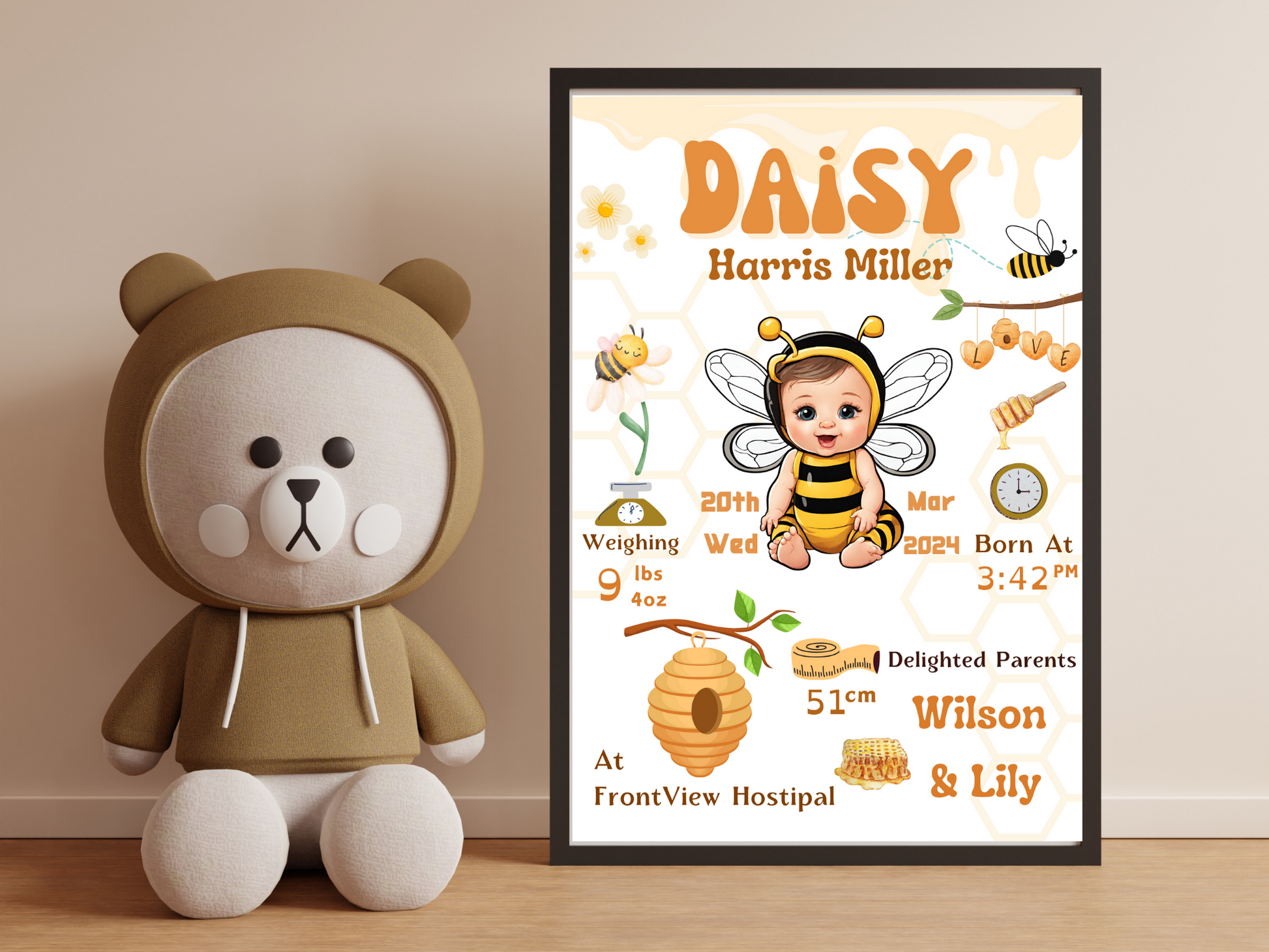 Custom New Born Baby Girl Gift, New Born Gift, Personalised Baby Girl Gift, Honey Bee themed Girl Baby Personalized print,Birth Detail
