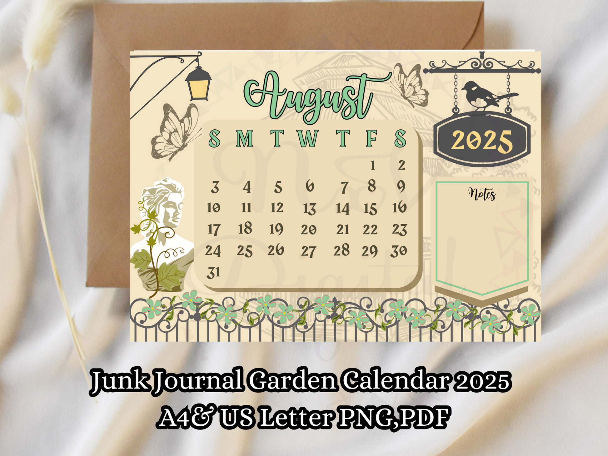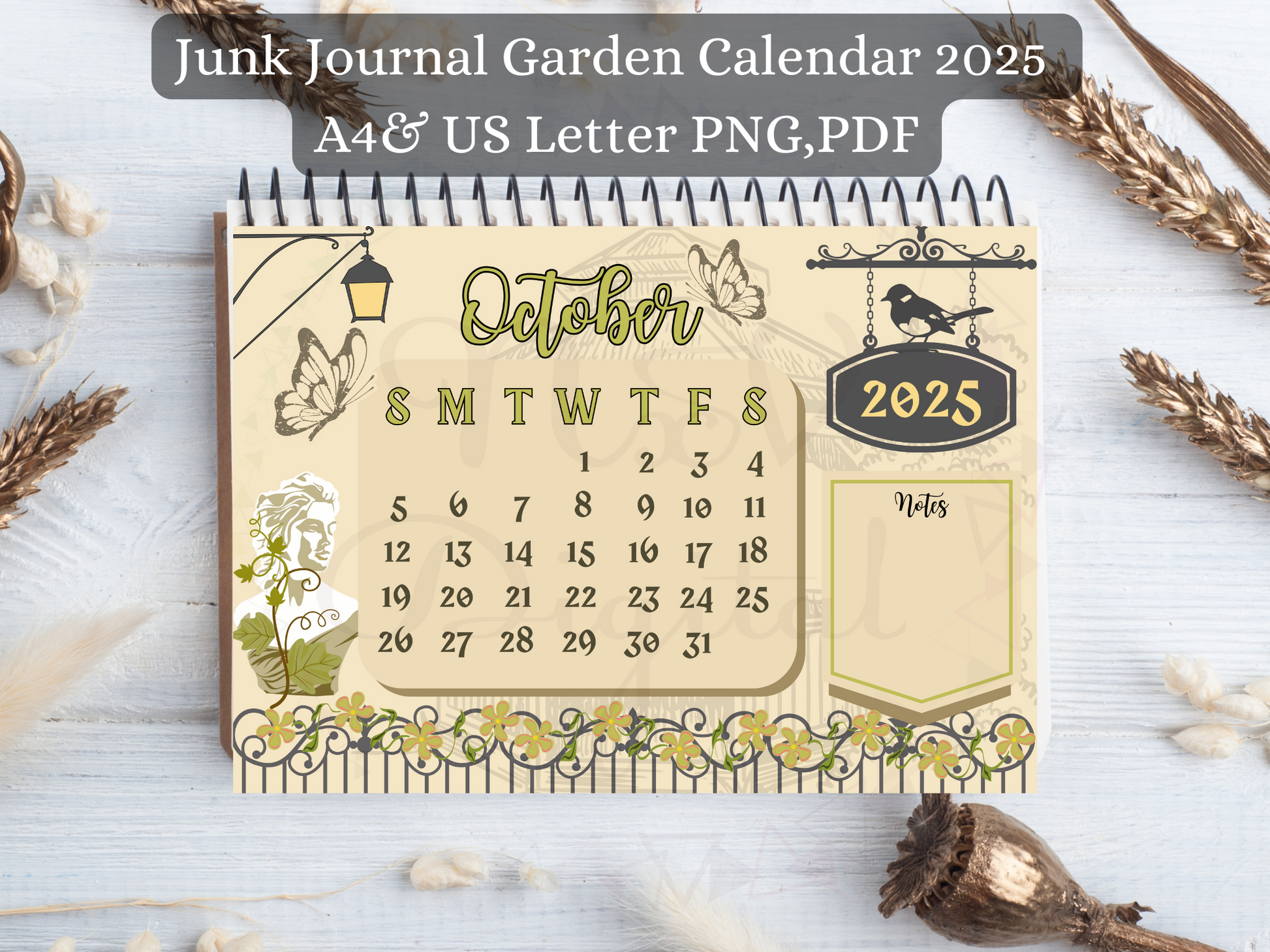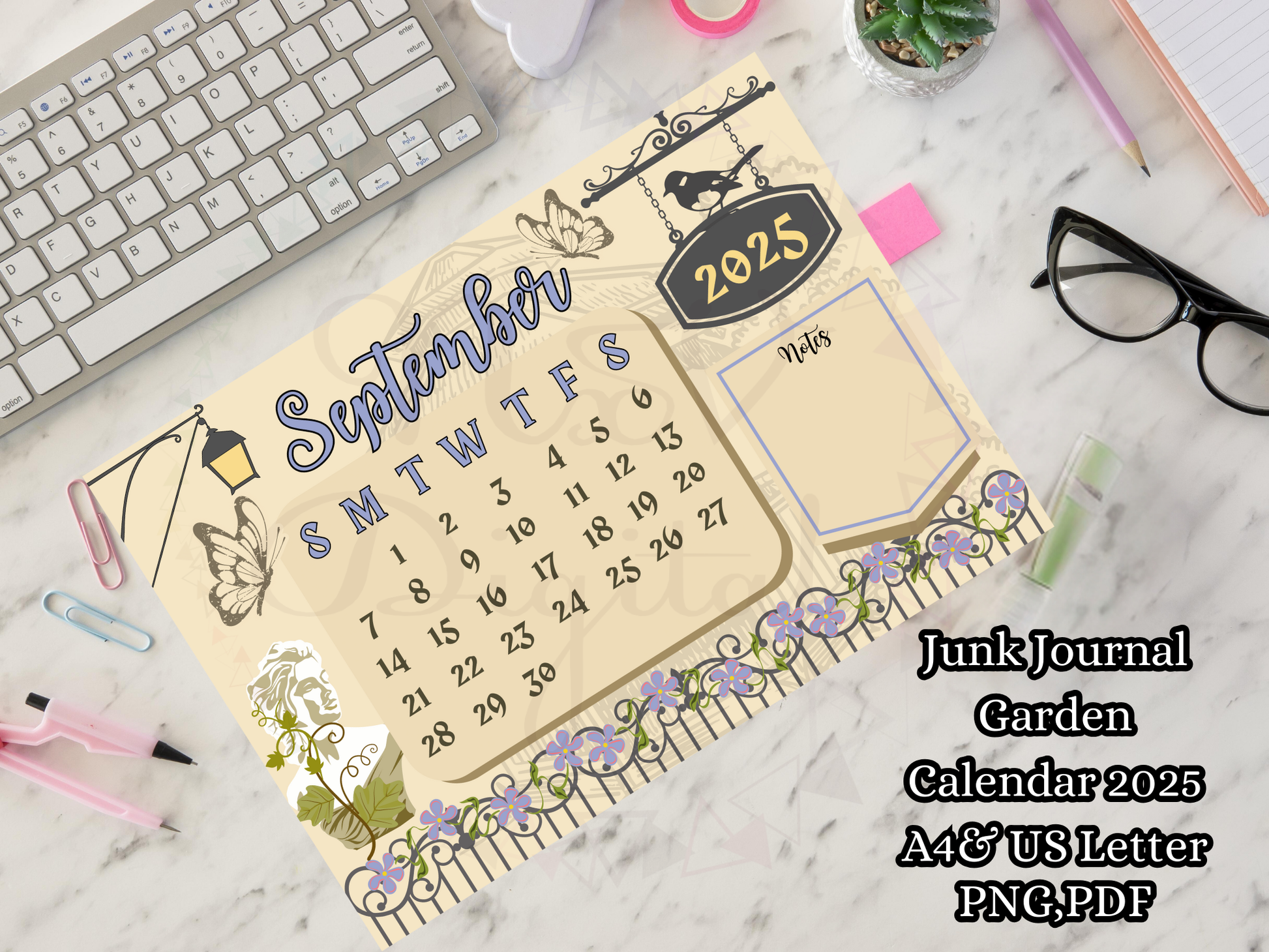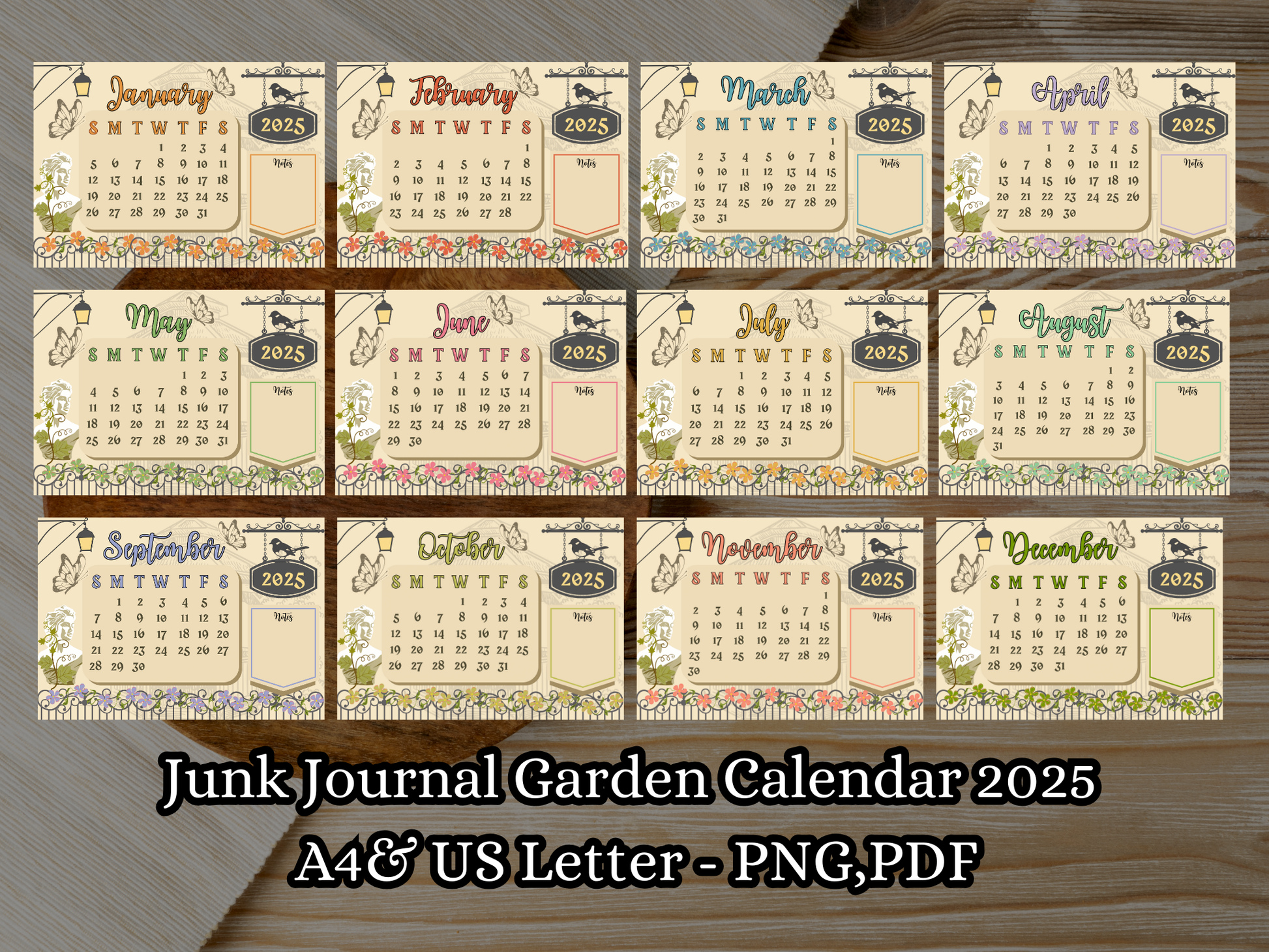 Junk Journal Garden Calendar 2025 Png, Scrapbook Calendar Kit, Printable Calendar 2025 Floral, Monthly Calendar, Digital Download Landscape