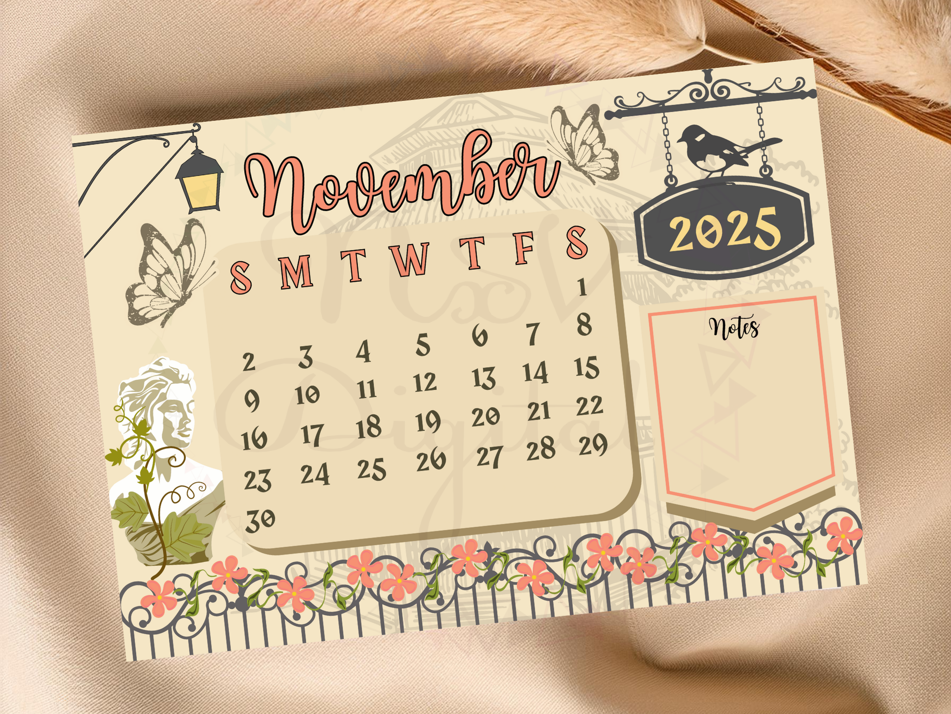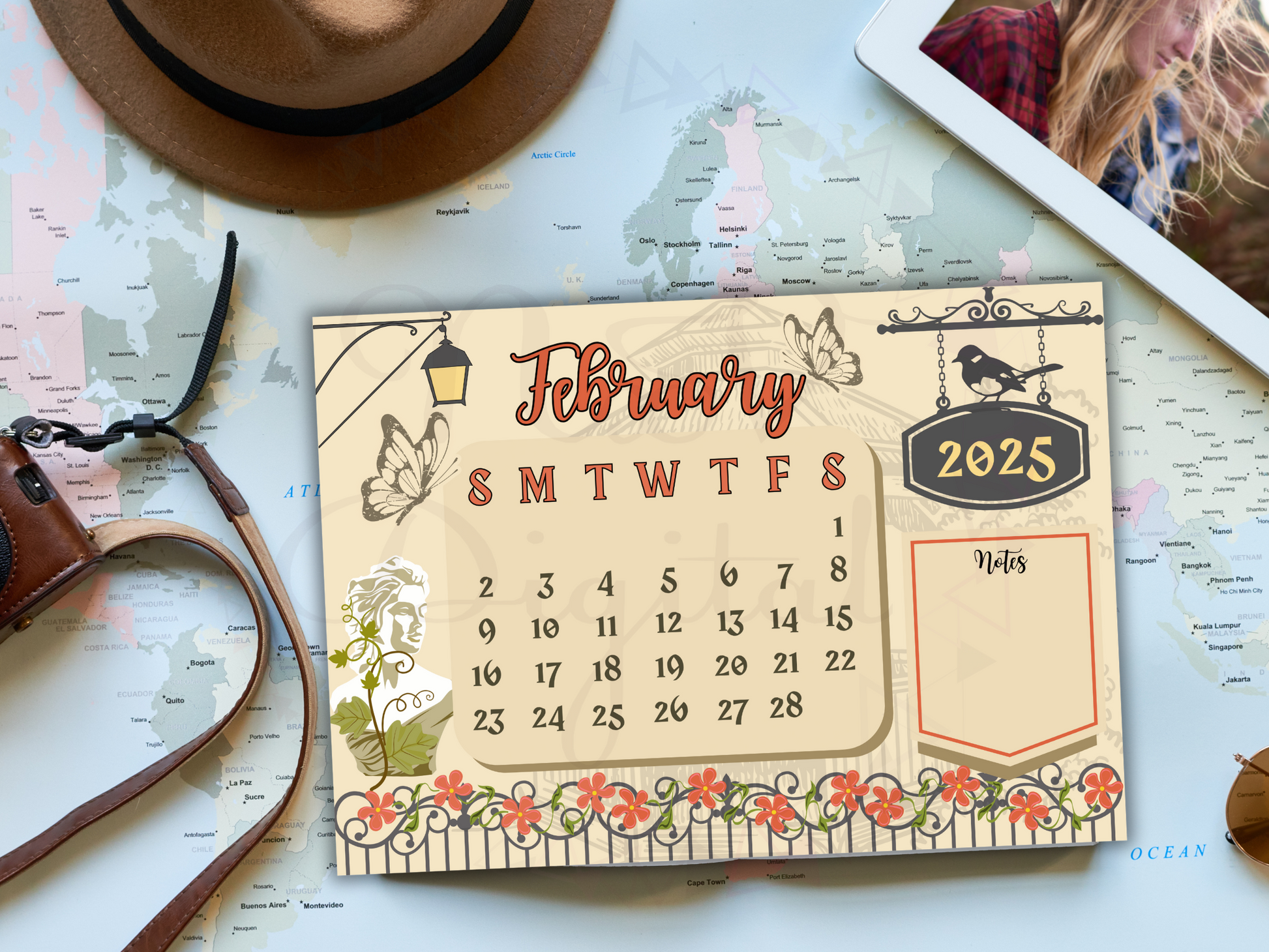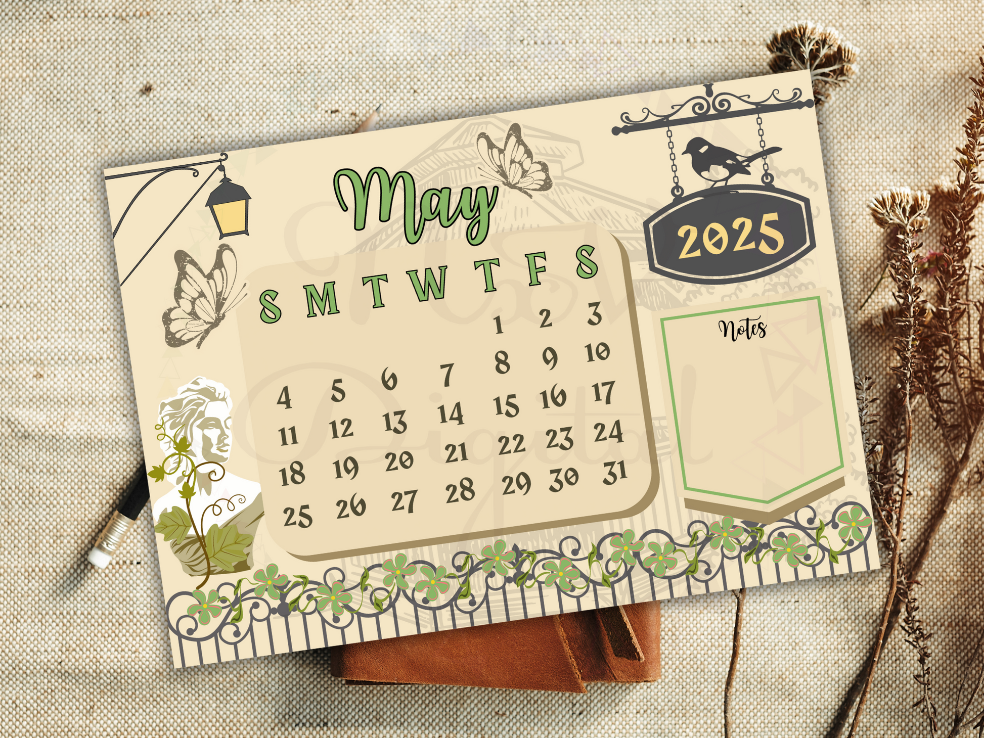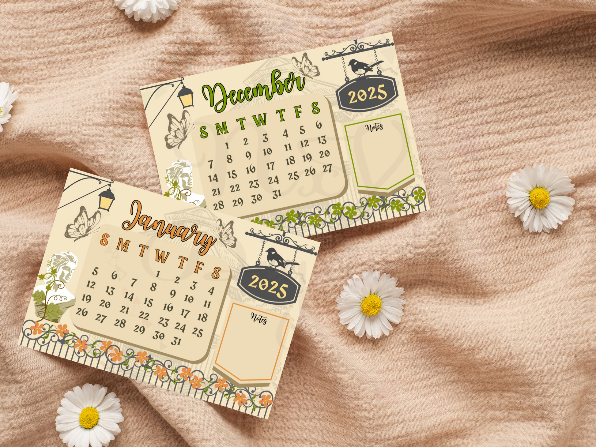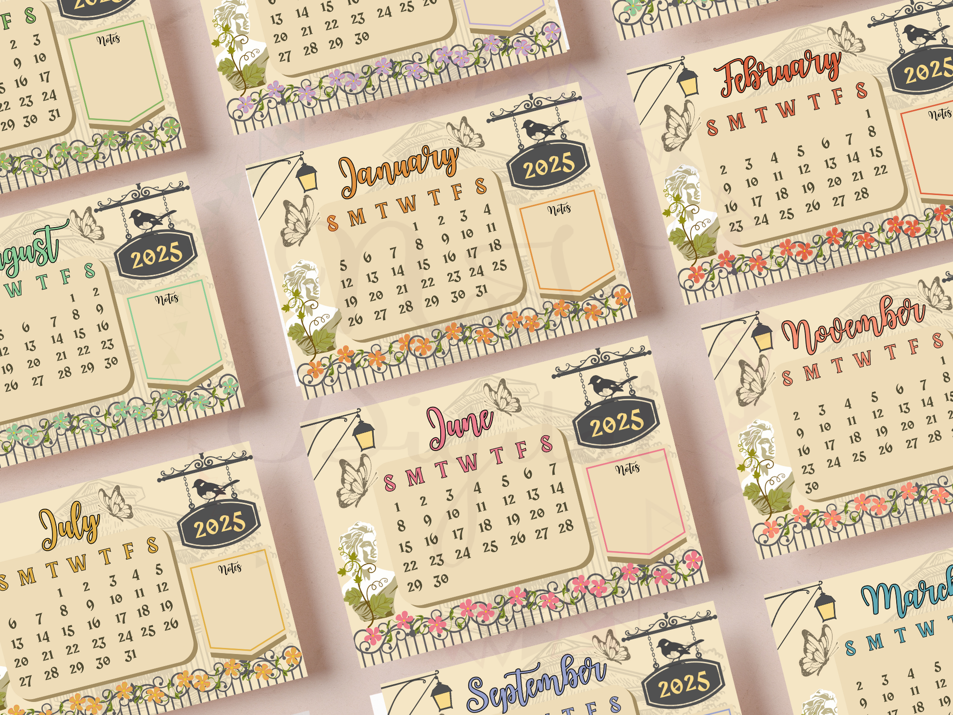 Junk Journal Garden Calendar 2025 Png, Scrapbook Calendar Kit, Printable Calendar 2025 Floral, Monthly Calendar, Digital Download Landscape