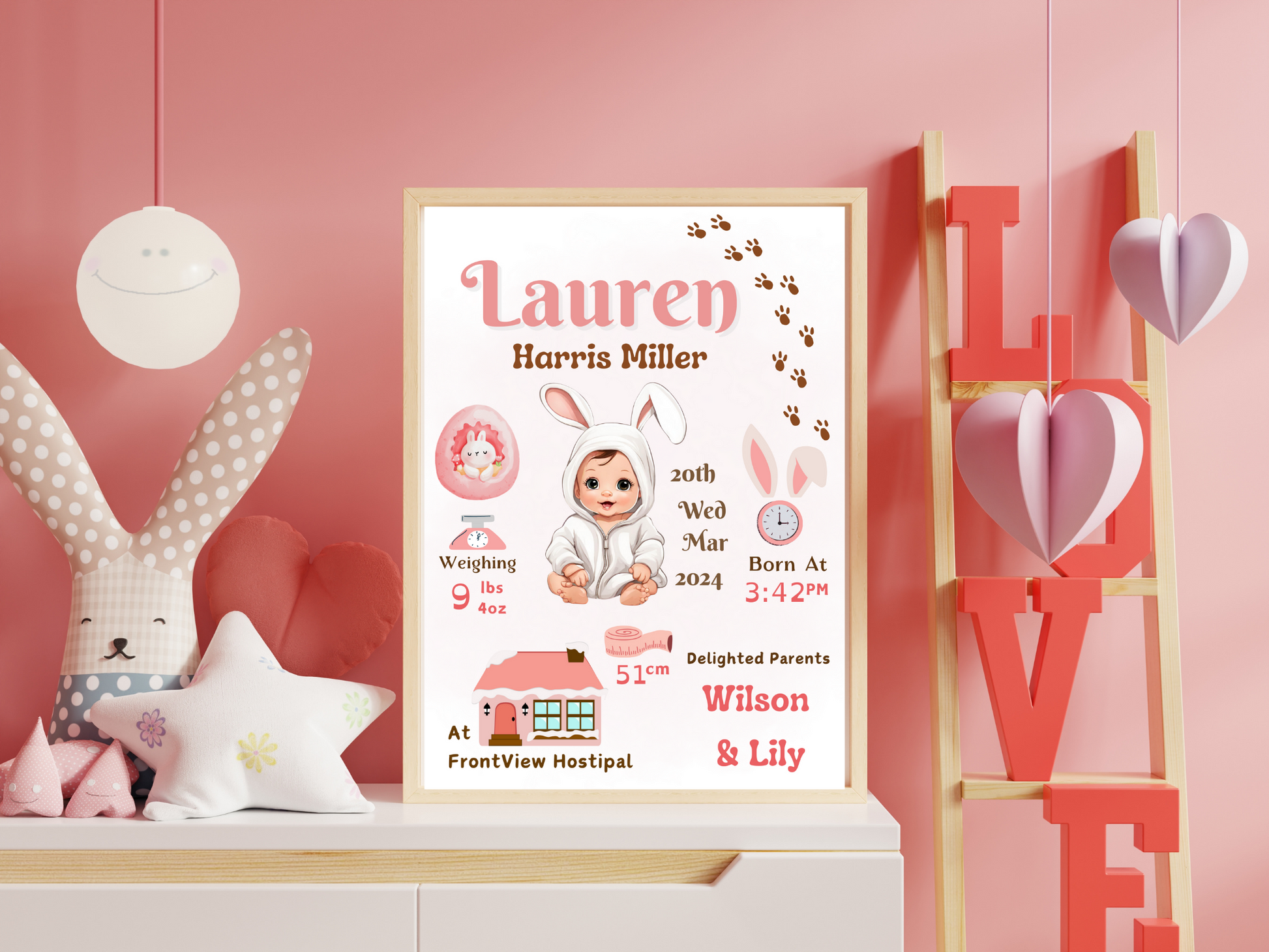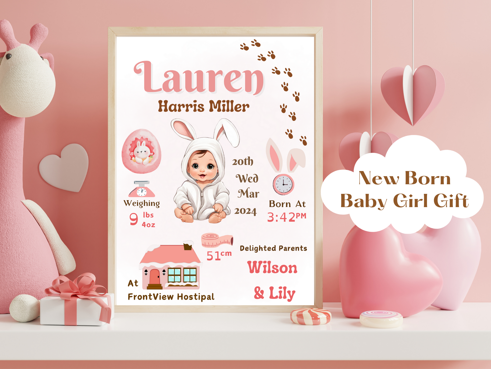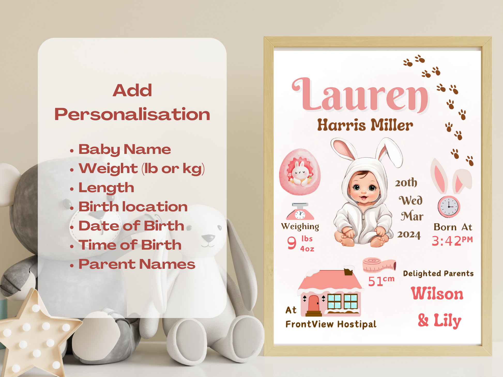 Cute Rabbit Custom New Born Baby Girl Gift, New Born Gift, Personalised Baby Girl Gift, Pink Rabbit Princess themed Girl Baby Personalized print,Birth Detail