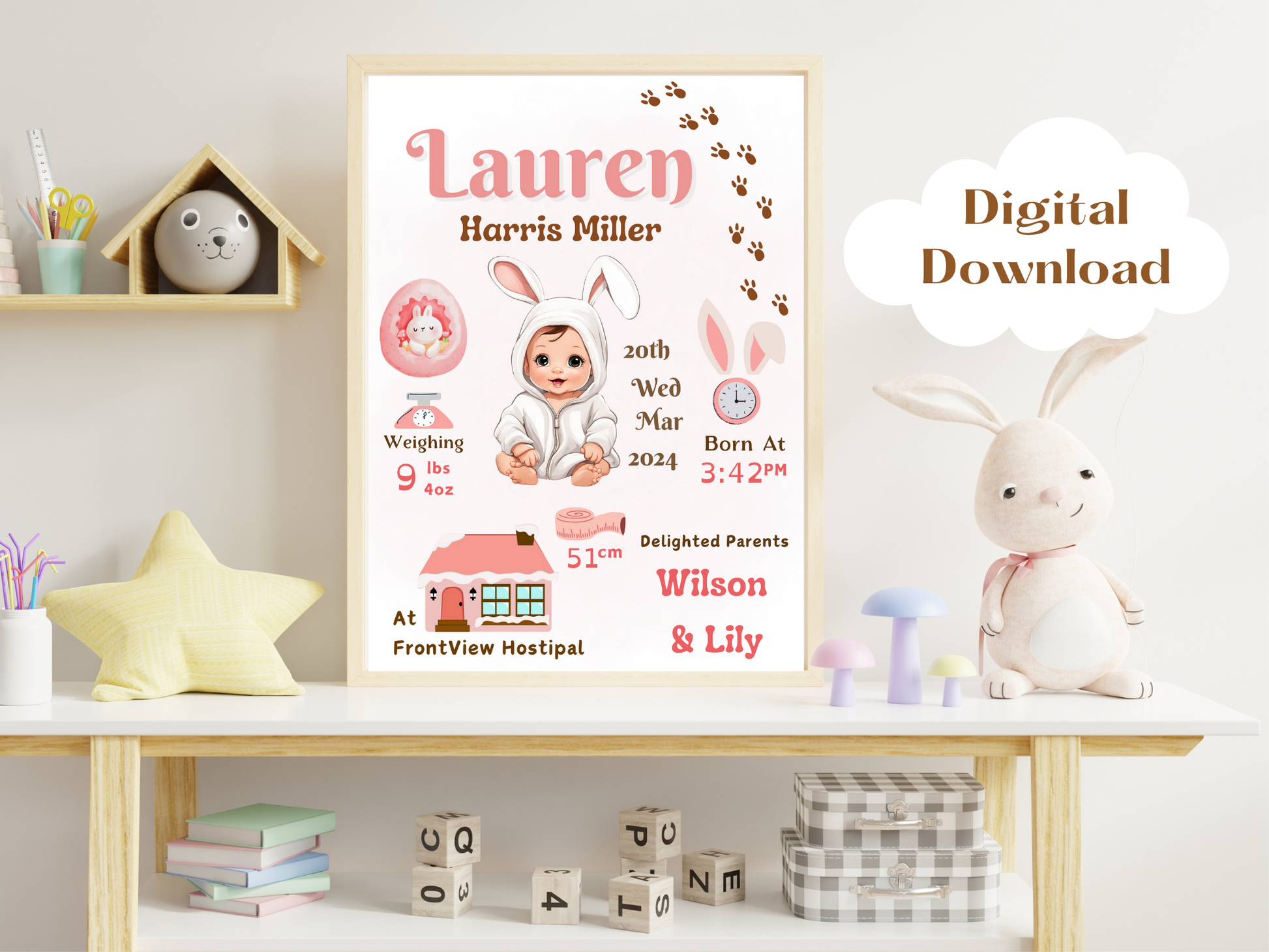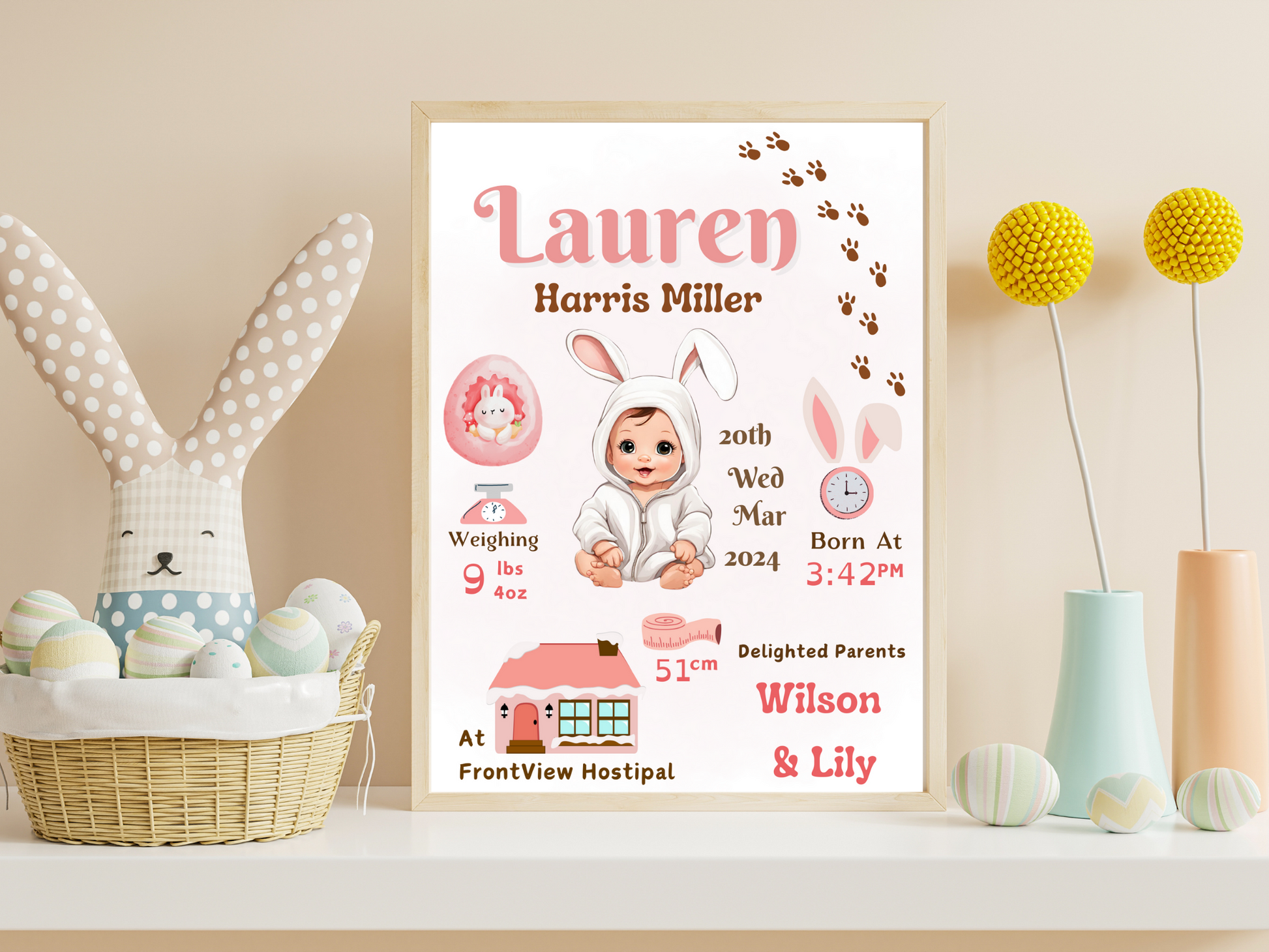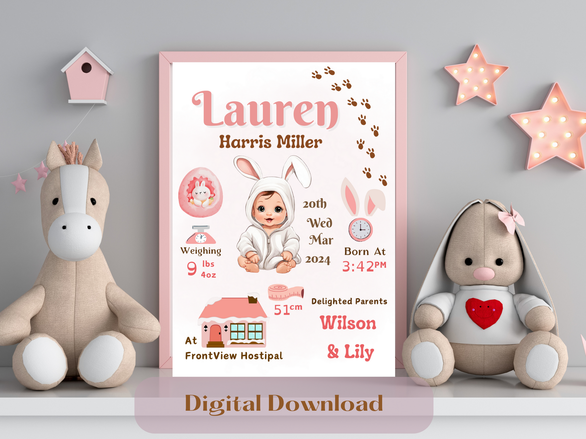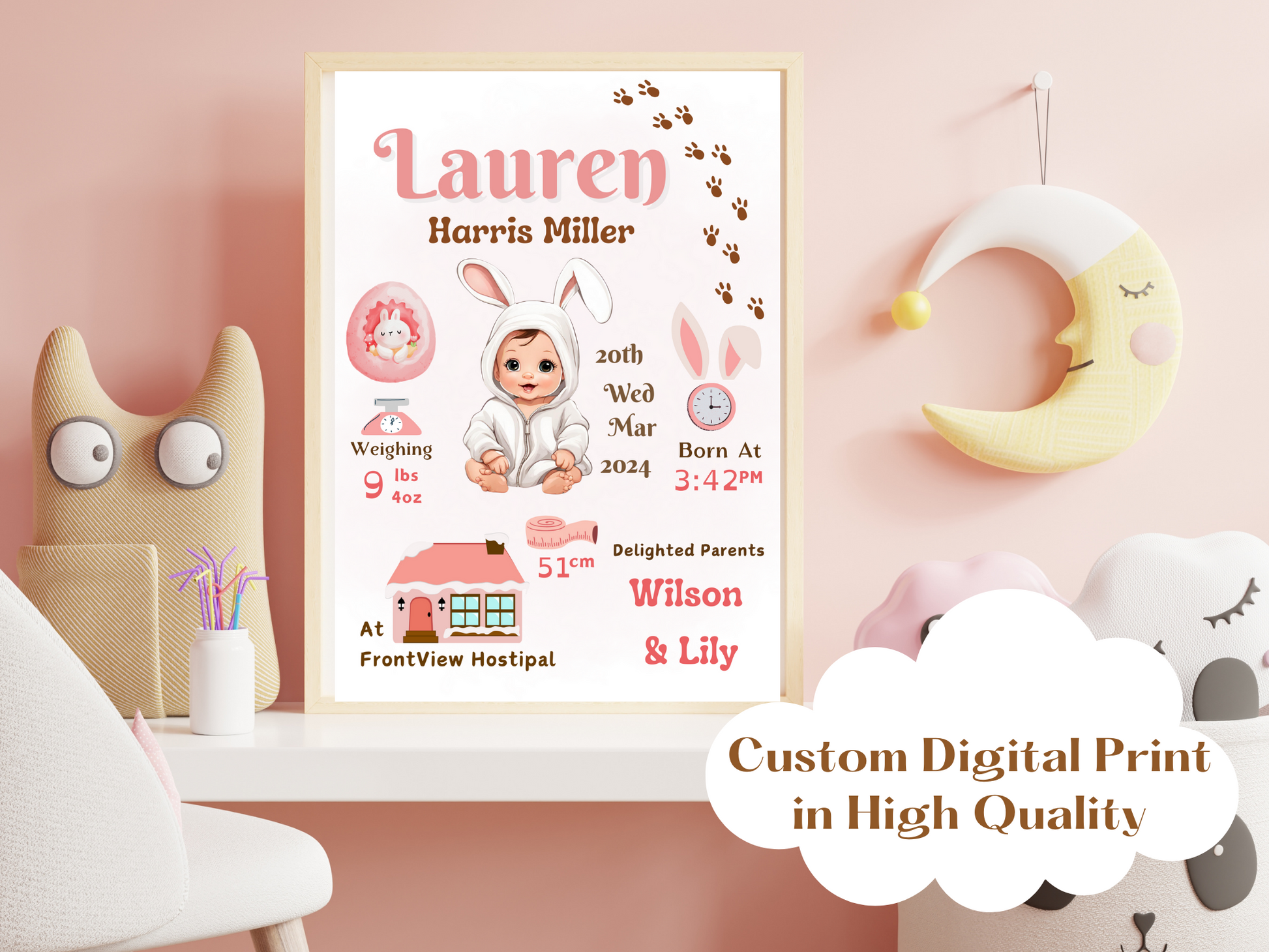 Cute Rabbit Custom New Born Baby Girl Gift, New Born Gift, Personalised Baby Girl Gift, Pink Rabbit Princess themed Girl Baby Personalized print,Birth Detail