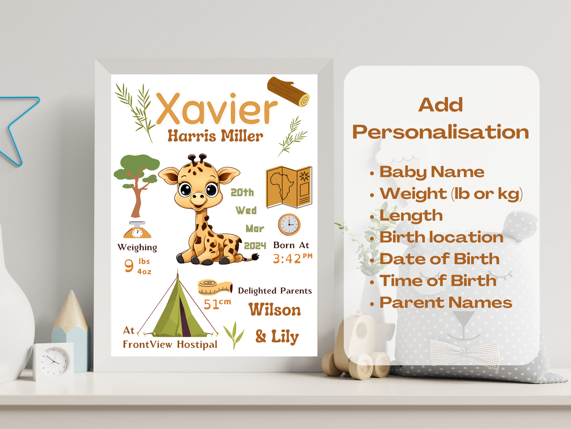 Baby Boy Gift, New Born Boy Baby Personalised Print For Boy, Gift for Baby Boy in Blue, Safari Giraffe themed Boy Baby print, Baby Birth Details