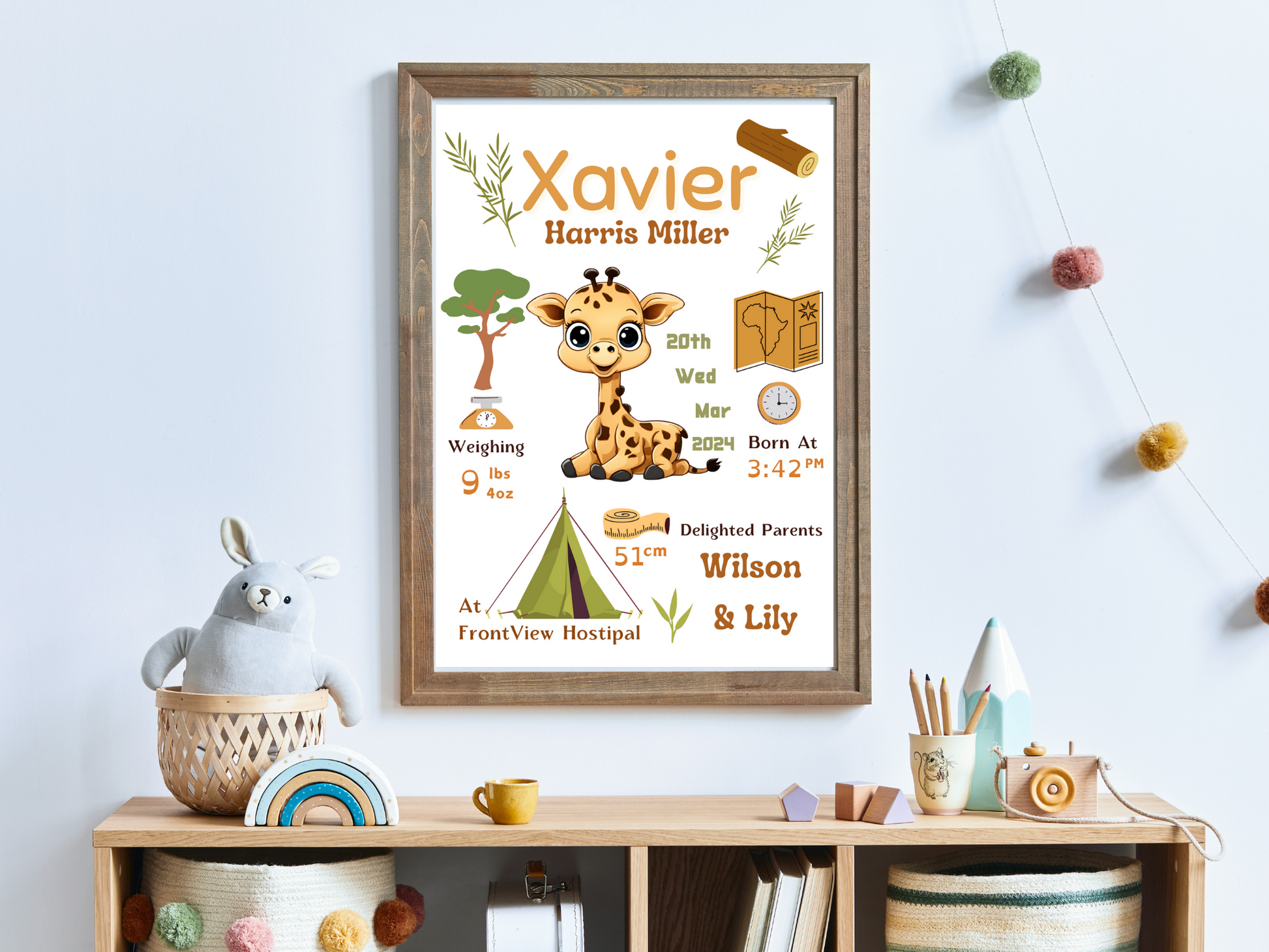 (example: John Harris Miller, 9lbs 4oz or 3.1 kg, 51cm or 20 inch, Frontview hostipal, 11-monday-march-2024, 3.42 pm, wilson and lily)