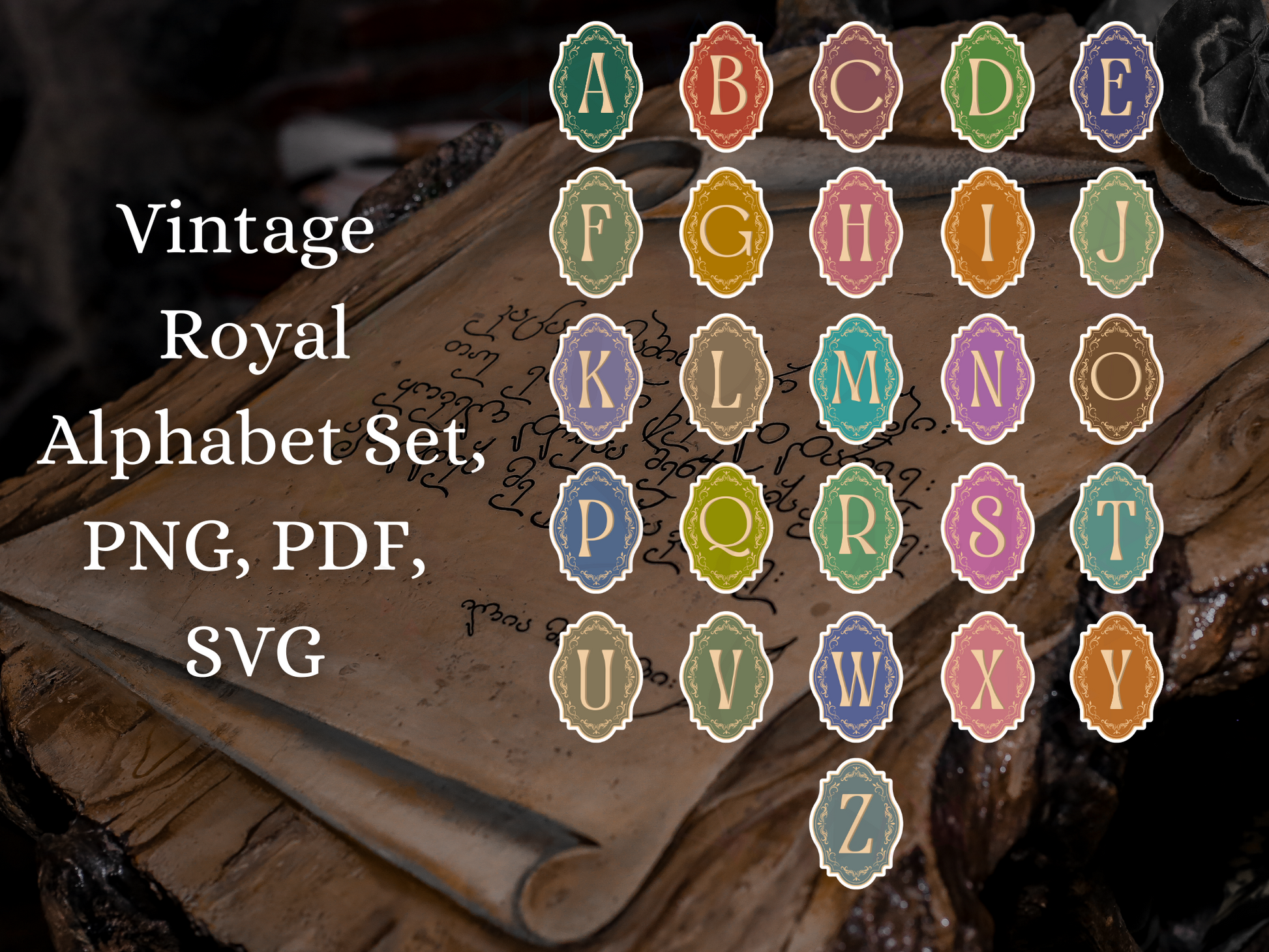 Set of 36 Junk Journal Vintage Royal Letter Png, Scrapbook Alphabet Kit Png, Cute Vintage Colour Alphabet Sticker bundle Png, junk journal Art Nouveau floral printable